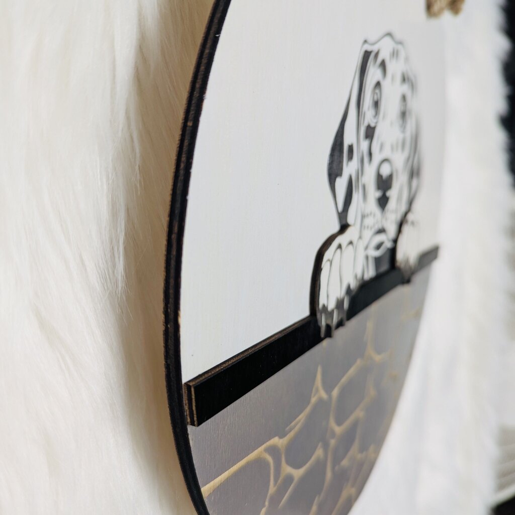 Decorative sign featuring Dalmatian, looking over the wall, top of the all and paws are on a second wood layer,...