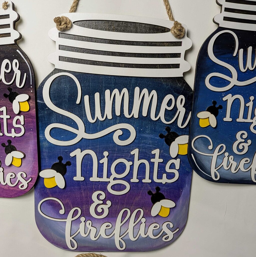 Laser-cut and hand-painted wood, mason jar shaped with fireflies giving this sign a 3 layers total for a 3D look....