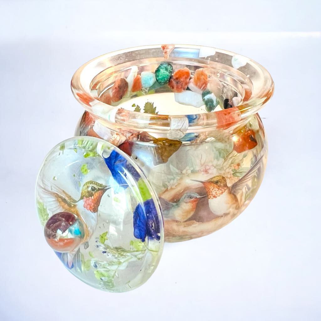 This beautiful hummingbird themed jar is made with real flower petals and natural gemstones. Perfect for storing jewelry or tiny...