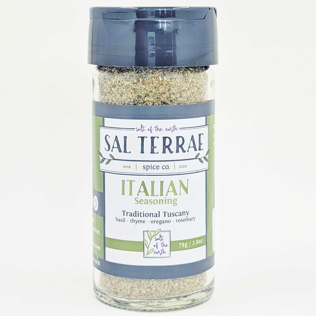 Italian Seasoning by Sal Terrae. Traditional Tuscany. Ingredients: salt, black pepper, oregano, onion, garlic, rosemary, basil, thyme, sage