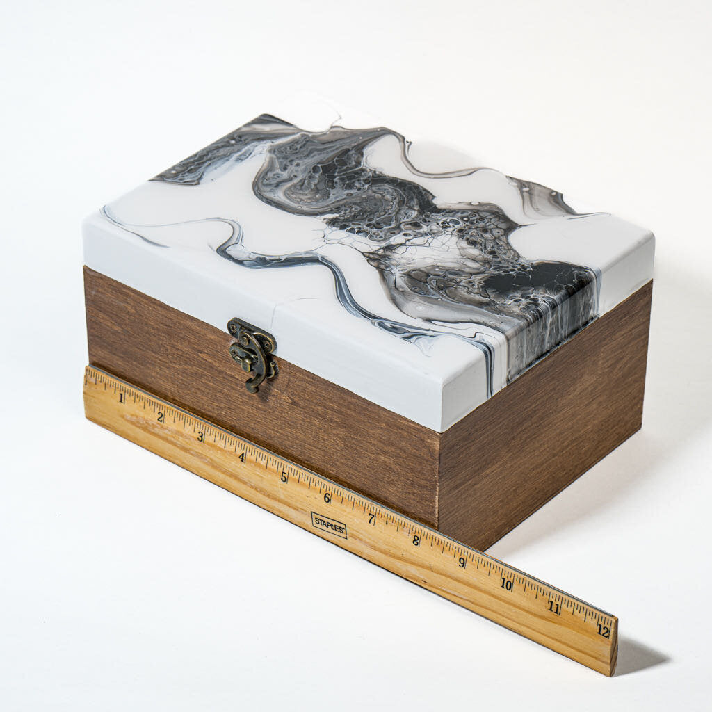 A substantial and sophisticated storage piece, ideal for larger jewelry collections, keepsakes, or special mementos. The artwork on the lid becomes the focal point - a dynamic composition of color and movement, sealed in a high-gloss resin that enhances depth and luminosity. This size offers presence - both as functional storage and as a decorative art object.
