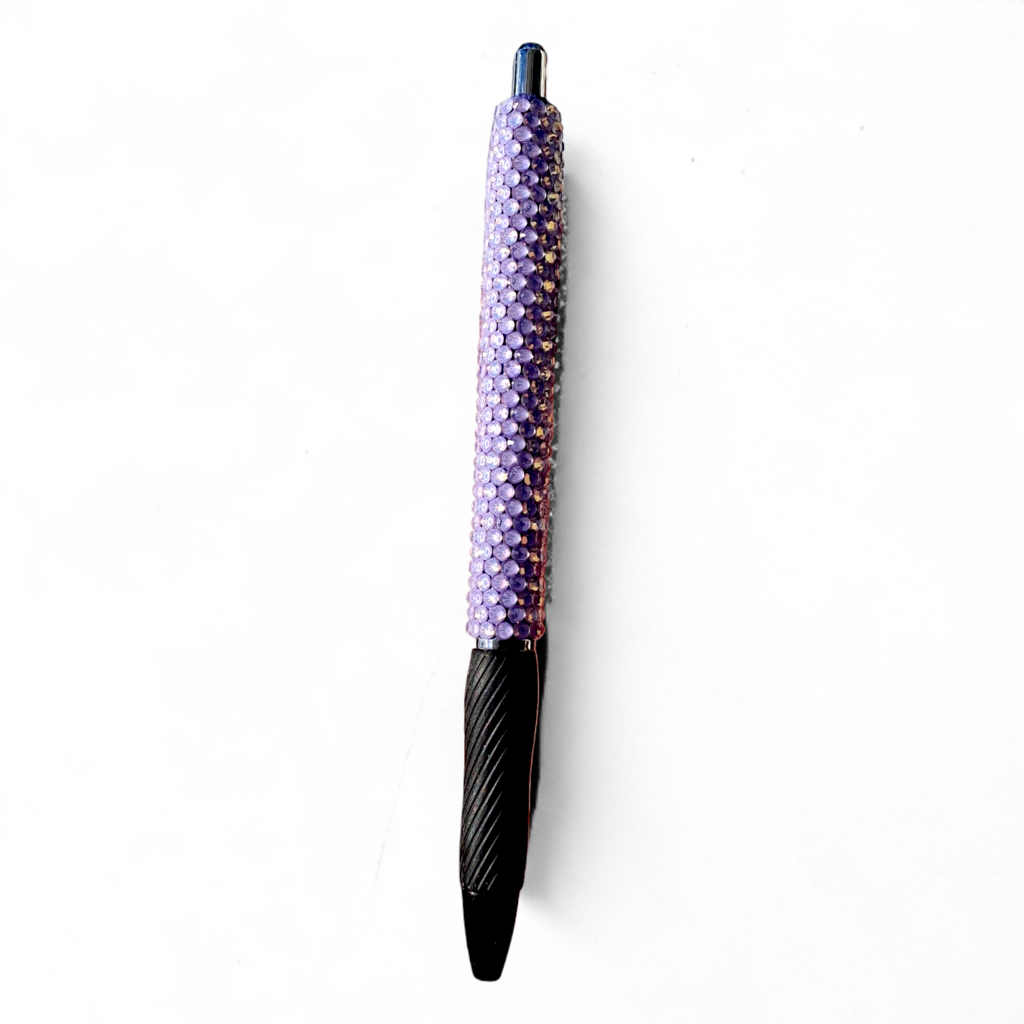 This pen was created by individually applying each rhinestone one by one! The ink color is represented by the color of the tip of the pen, with a blue ink refill included. Full rhinestone pens are created using a Paper Mate Ink Joy Gel pen as the base. The grip pens use Sharpie S Gel pens as a base.