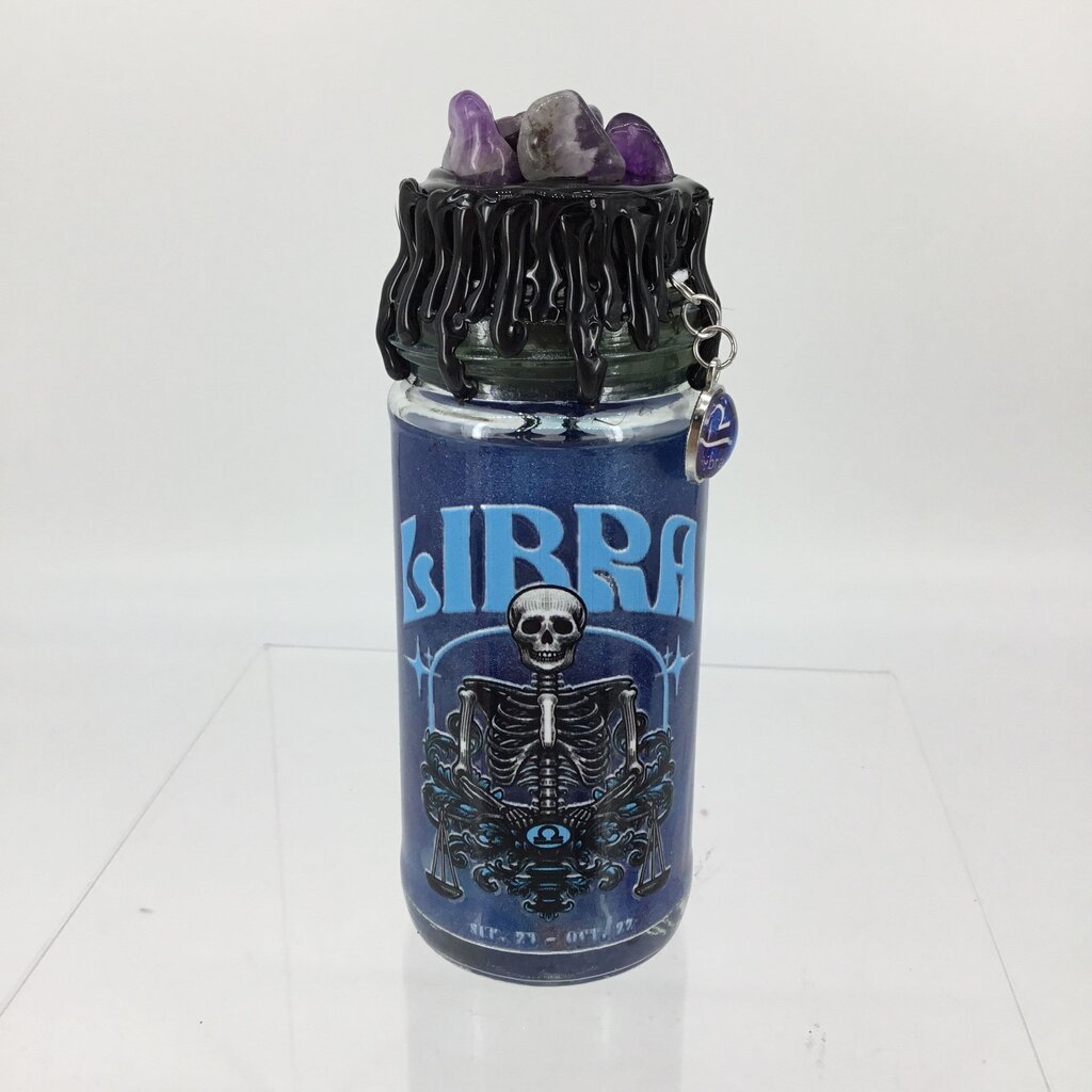 Decorative One-of-a-kind Glass Potion Bottle, Color Changing when shaken. Contains Amethyst and a Hanging Skeleton. Bottle is sealed. Do not...