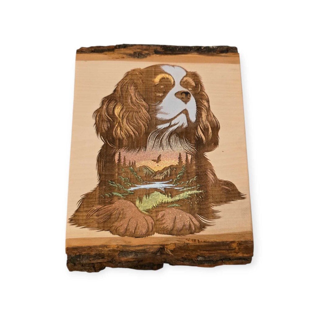 Engraved into the wood and handpainted. Sawtooth hanger on the back