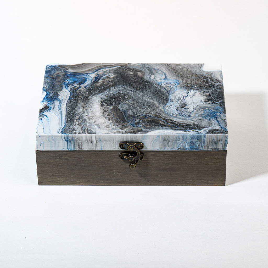 Elegant and modern in proportion, this low-profile chest offers generous space for jewelry, keepsakes, photographs, or cherished letters. The smooth resin surface enhances depth and color, giving the artwork a glass-like brilliance while the stained wood base adds warmth and contrast. A refined statement piece for bedroom, office, or studio.