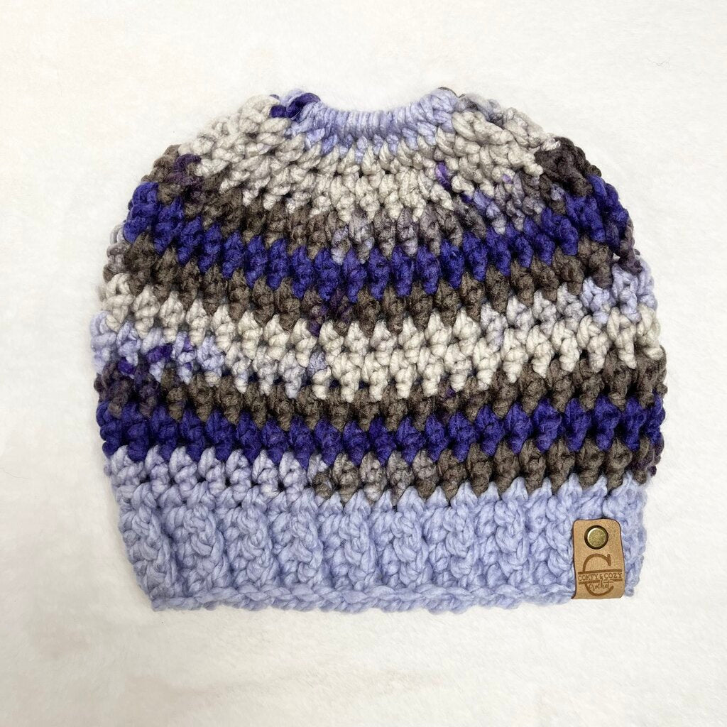 Crochet ponytail/messy bun hat made with acrylic yarn. Pull your ponytail or messy bun through the opening on the top!...