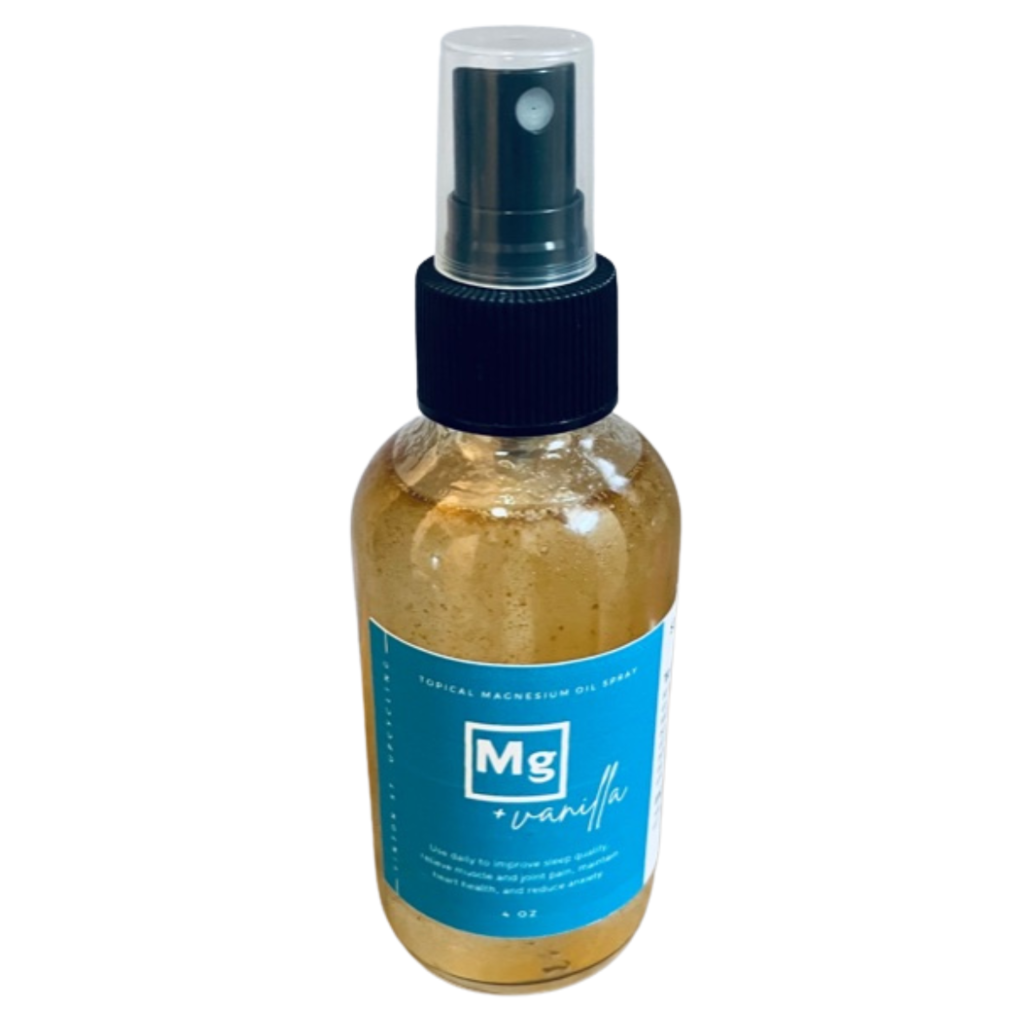 Use daily to help improve sleep quality, relieve muscle and joint pain, maintain heart health, and reduce anxiety. Mg+vanilla: Infused with warmth and coziness, this blend is a dream for sore muscles. Ingredients: Magnesium chloride flakes, distilled water, and vanilla, clove, and orange essential oils -4oz glass spritz Spray on arms, legs, and stomach area and allow to dry before getting dressed. Avoid spraying in or near eyes and open wounds. Slight irritation may happen when first using (particularly in those with a magnesium deficiency). If this occurs, decrease frequency of use. You may also wipe off after 20-30 minutes while still receiving maximum benefits. We recommend testing the spray on a small patch of skin to check your body’s compatibility.