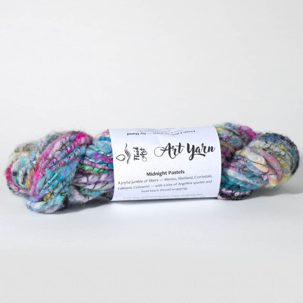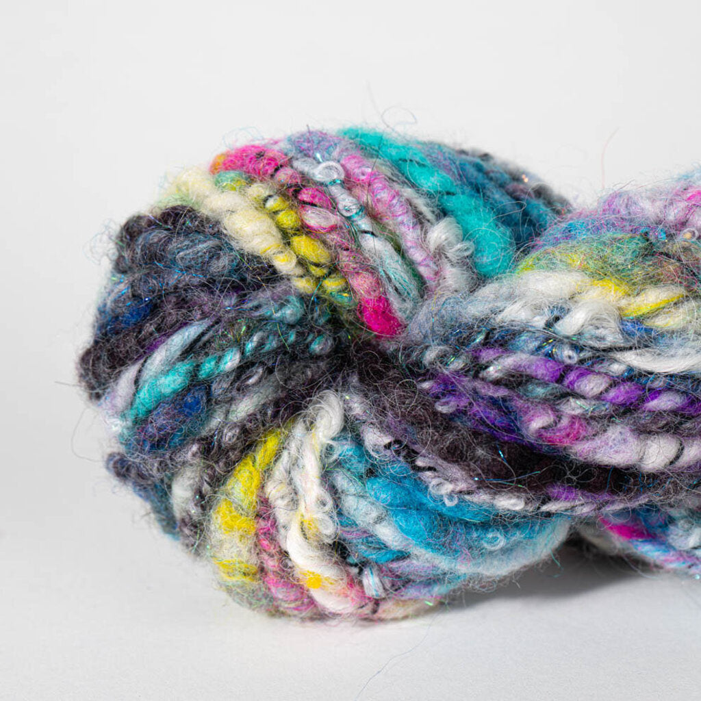 A joyful jumble of fibers - Merino, Shetland, Corriedale, Falkland, Cotswold - with a kiss of Angelina sparkle and bold black thread wrapping. Core spun and hand dyed in many small batches to create a dreamy swirl of pastel hues with extra loft. 56 yards of color-dappled whimsy Super bulky weight 75 g of fiber magic
