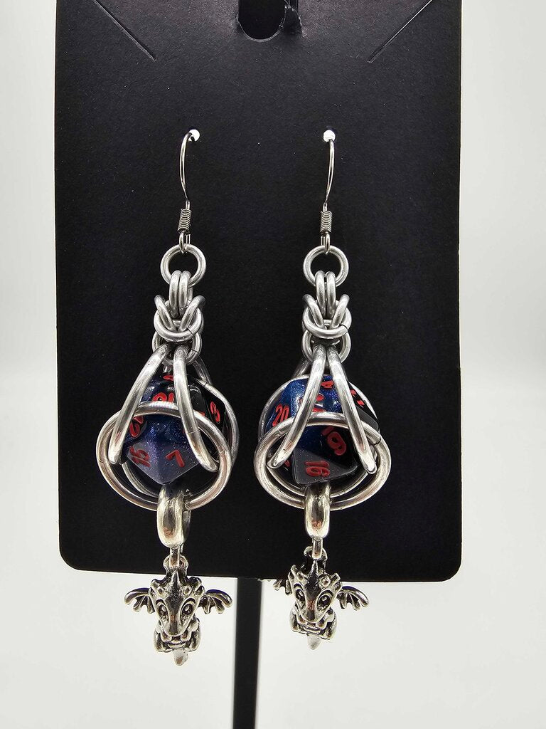 Mini D20 Earrings Silver with dark sparkly blue D20 and dragon charm
