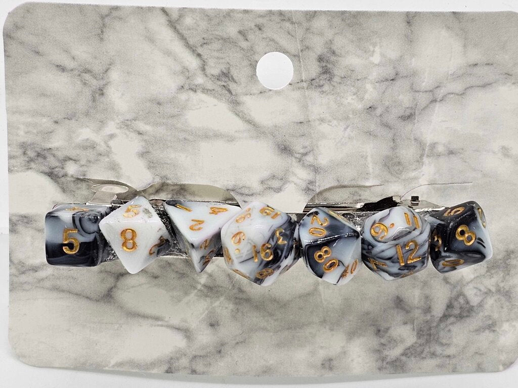 Mini Dice Barrette with Black and White Marble Dice with Gold numbers