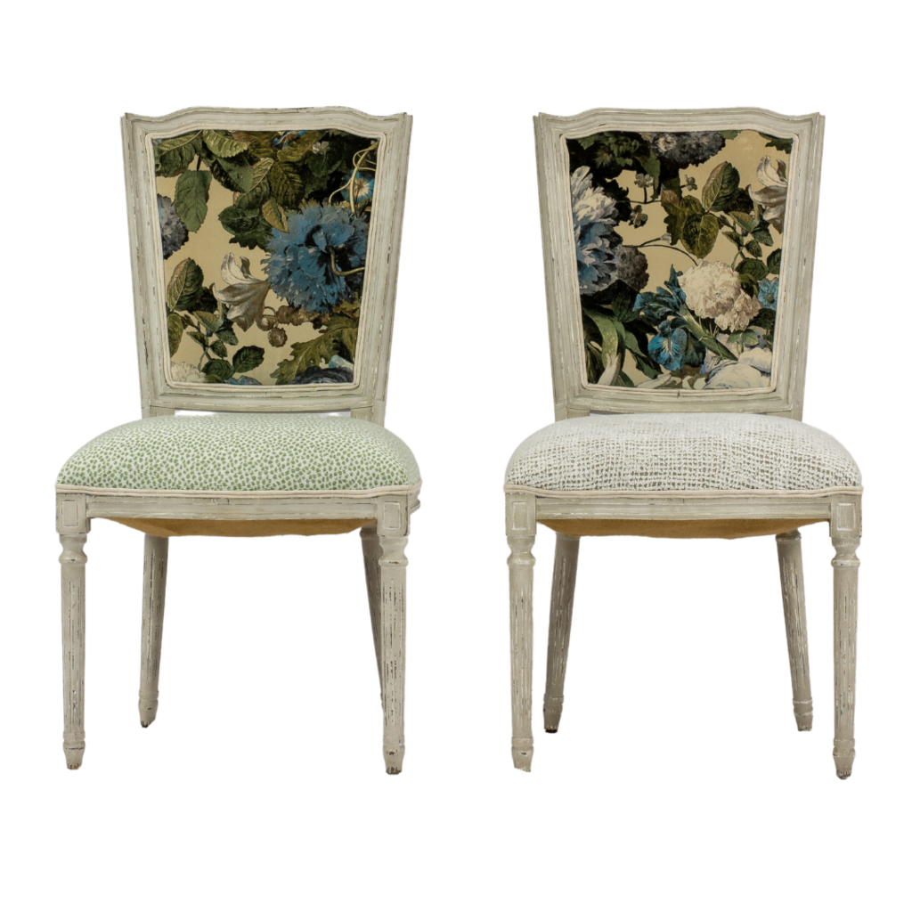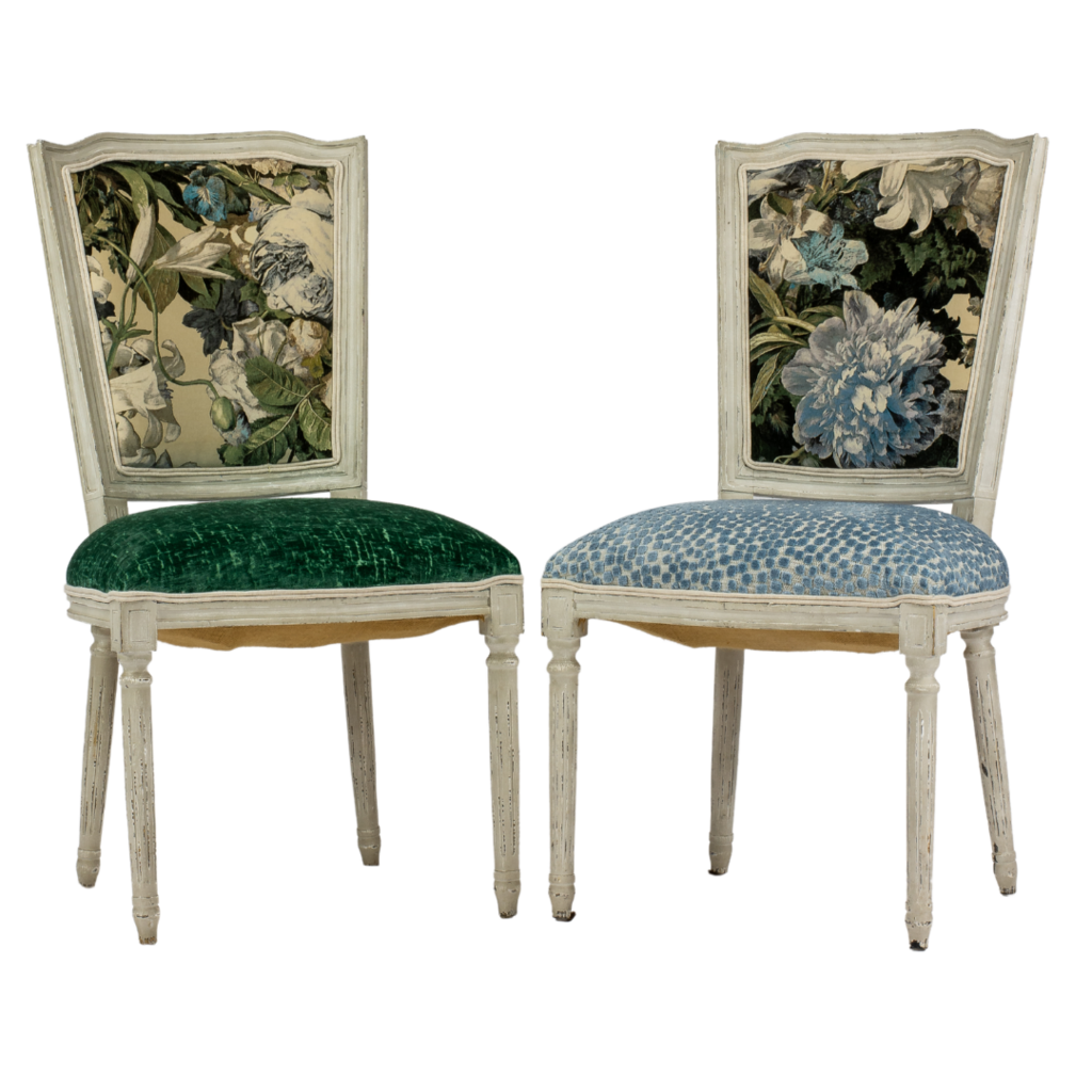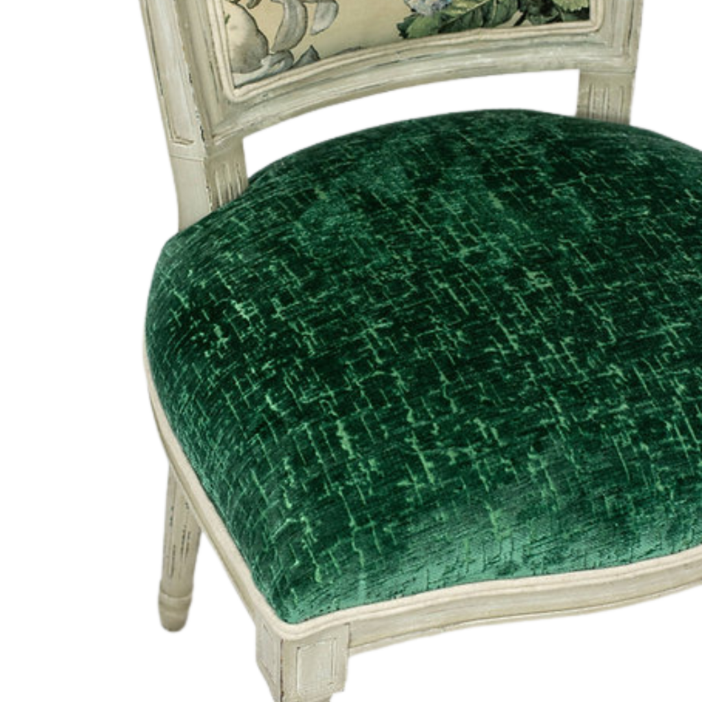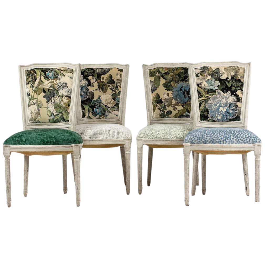 One-of-a-Kind newly upholstered Set of 4 French-inspired Louis XVI design dining chairs, each chair features a gracefully curved back newly upholstered with F.Schumacher Mulberry Floral Pompadour Velvet color Sage. Very good condition wood frame, minor scuffs wear; upholstery, new excellent!!!