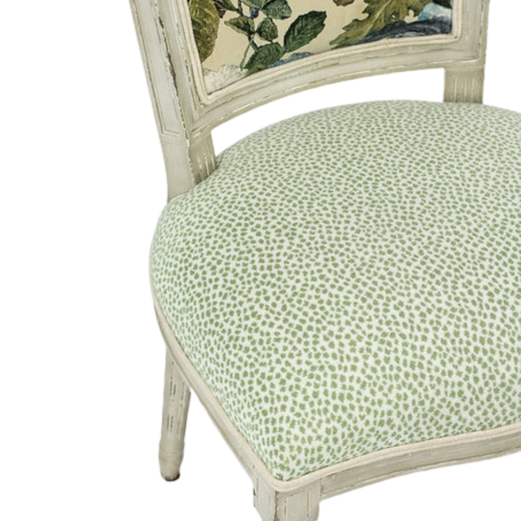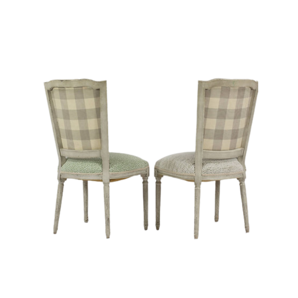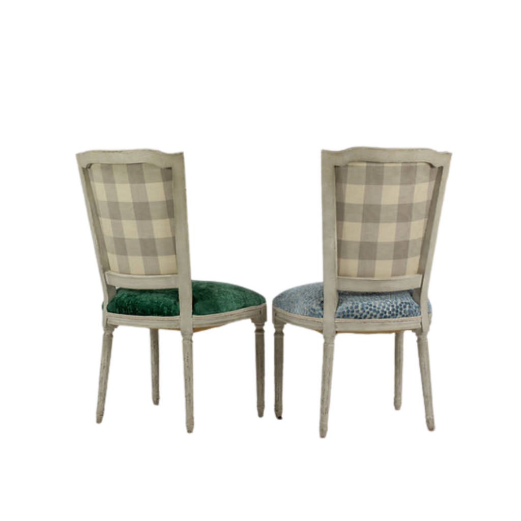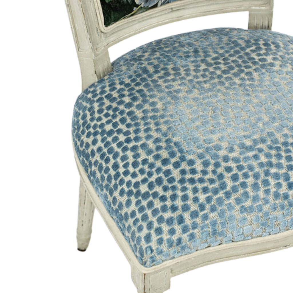 One-of-a-Kind newly upholstered Set of 4 French-inspired Louis XVI design dining chairs, each chair features a gracefully curved back newly upholstered with F.Schumacher Mulberry Floral Pompadour Velvet color Sage. Very good condition wood frame, minor scuffs wear; upholstery, new excellent!!!