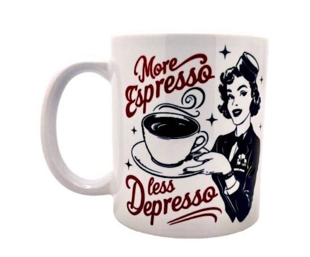“More Espresso Less Depresso” | 11 oz Ceramic Mug | PLEASE NOTE: this contains adult language; actual product not censored.