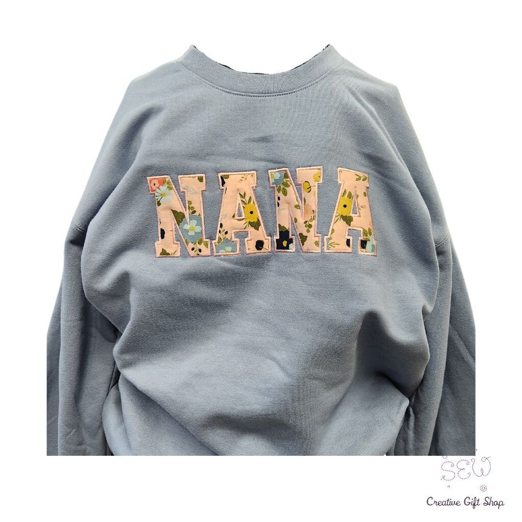 This sweatshirt has "Nana" appliqued in a delicate floral fabric. Staff - Additional items/sizes in backstock