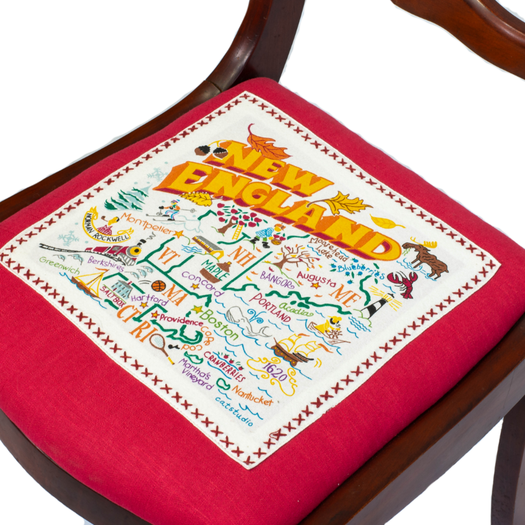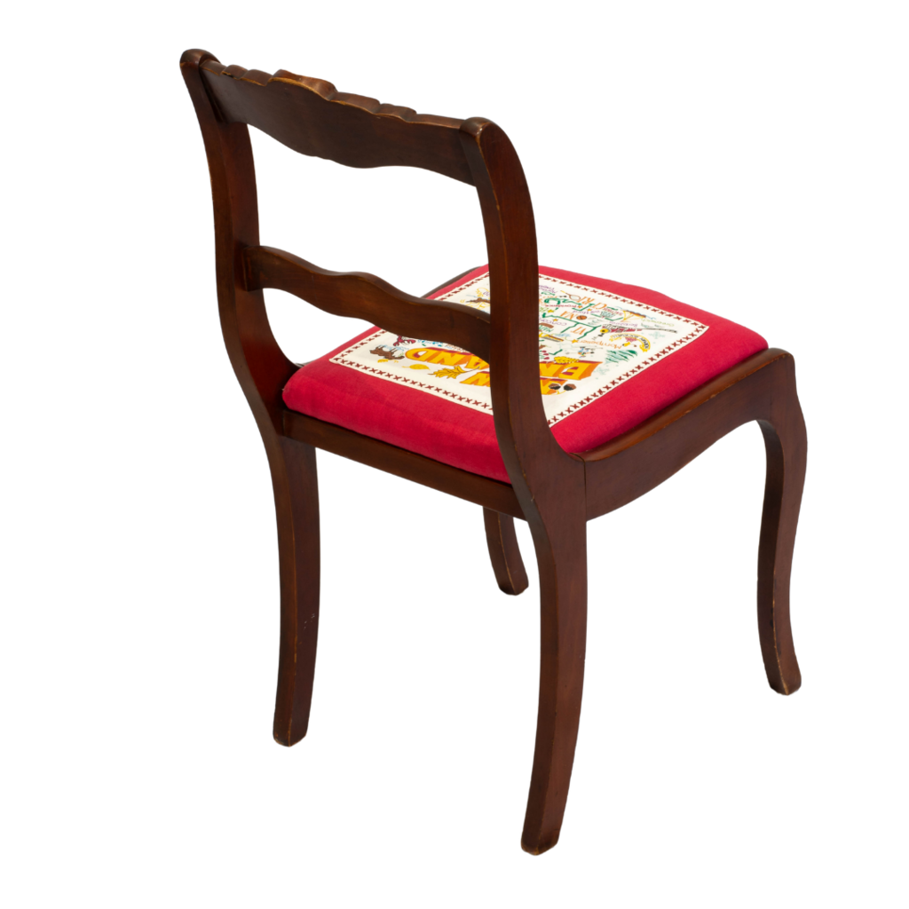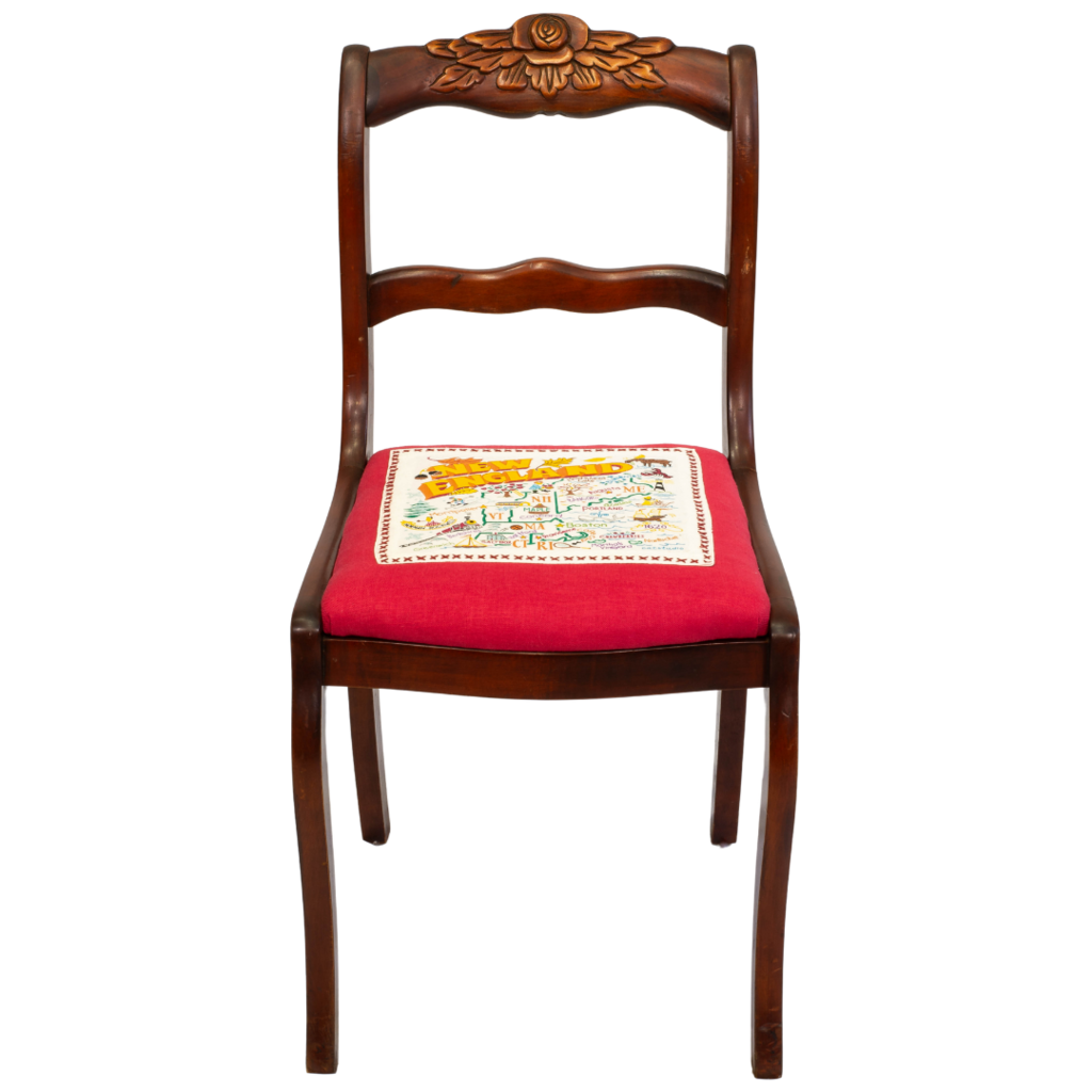 One-of-a-Kind newly upholstered qint essental New England American Carved Ladder accent side chair c. 1940's. New upholstery of red duck styled cavas with a charming floral carving at the crest rail with leaves, perfect for that antique bedroom corner.