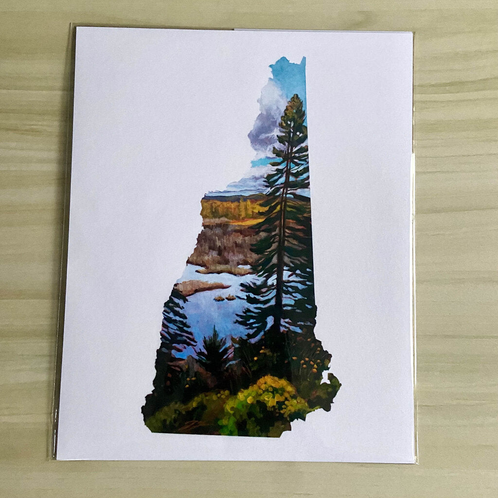 Fine art print on paper, 8x10 inches. Comes signed on the back and sealed in a protective sleeve with a rigid backing board and info slip. About the original: Acrylic gouache on paper, 11"x15", 2024, painted by Jackie Hanson This is the fourth New Hampshire-shaped painting I've created, and probably my favorite yet. It's an image from my college friends' Halloween wedding in the White Mountains. To create the original painting, I traced the cover of a New Hampshire atlas and transferred the shape to watercolor paper. Then, I applied 1/4" masking tape around the entire thing, did my painting in gouache, and peeled the tape away at the end.
