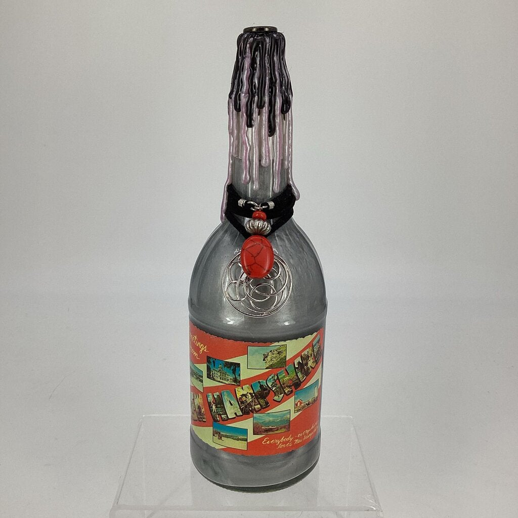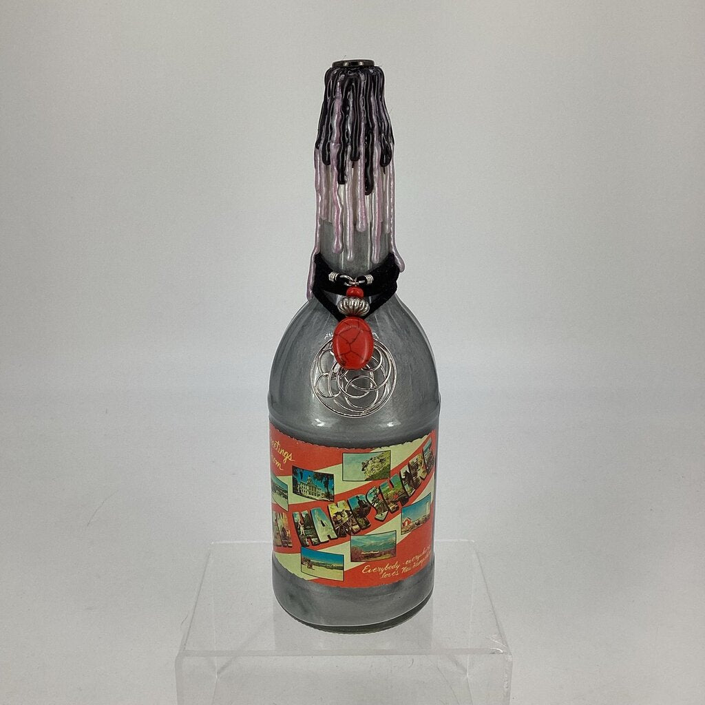 One-of-a-kind Decorative Potion Bottle. Contains Green Aventurine and enhanced with Vintage Jewelry. Color changing action when shaken.