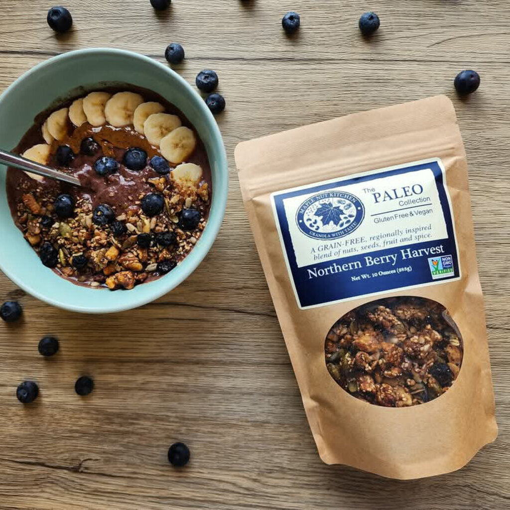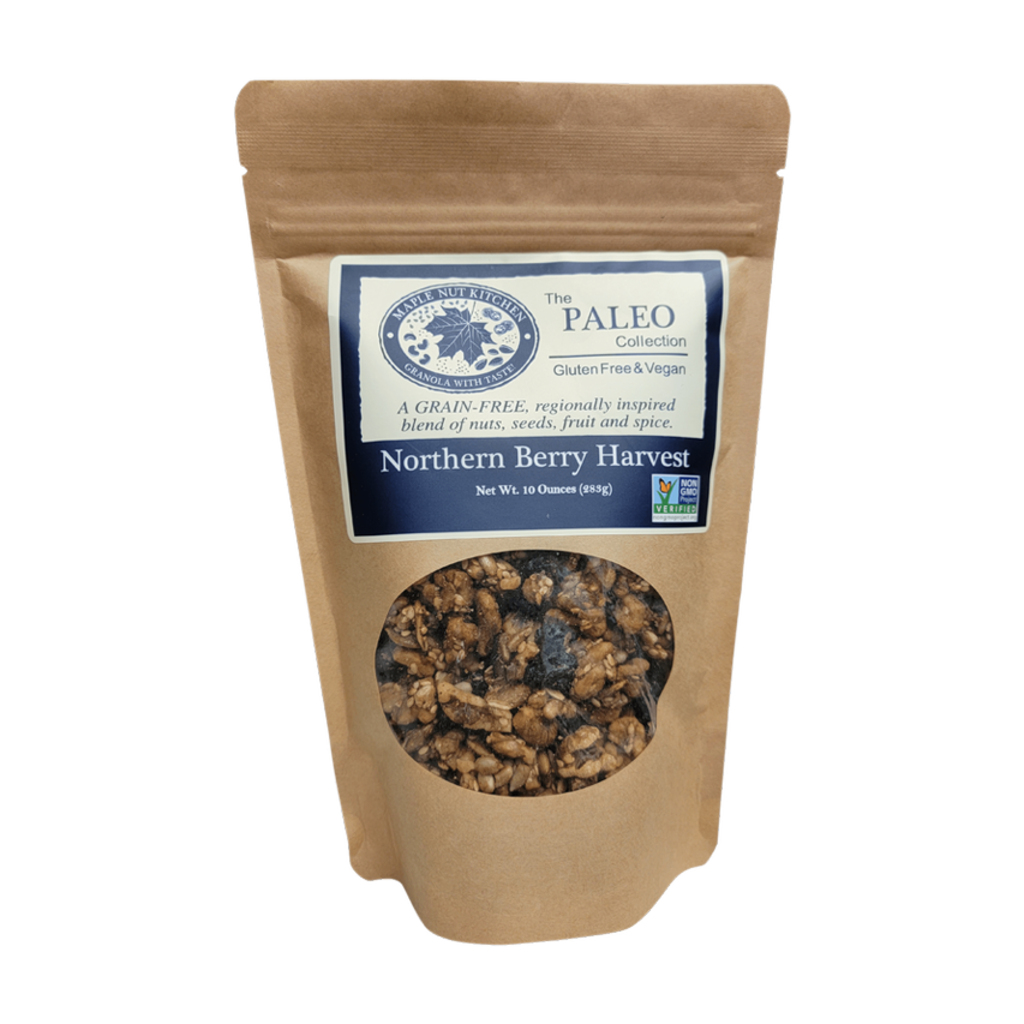 Northern Berry Harvest Granola from our Paleo Collection is a hearty and satisfying mix of scrumptious blueberries, walnuts, and seeds. With an enticing twist of vanilla and maple, it has been described by many as being truly mouthwatering! Pop it in your bag for when you’re hitting the trails, or eat it as cereal with some delicious almond milk. Weight - 10 Oz