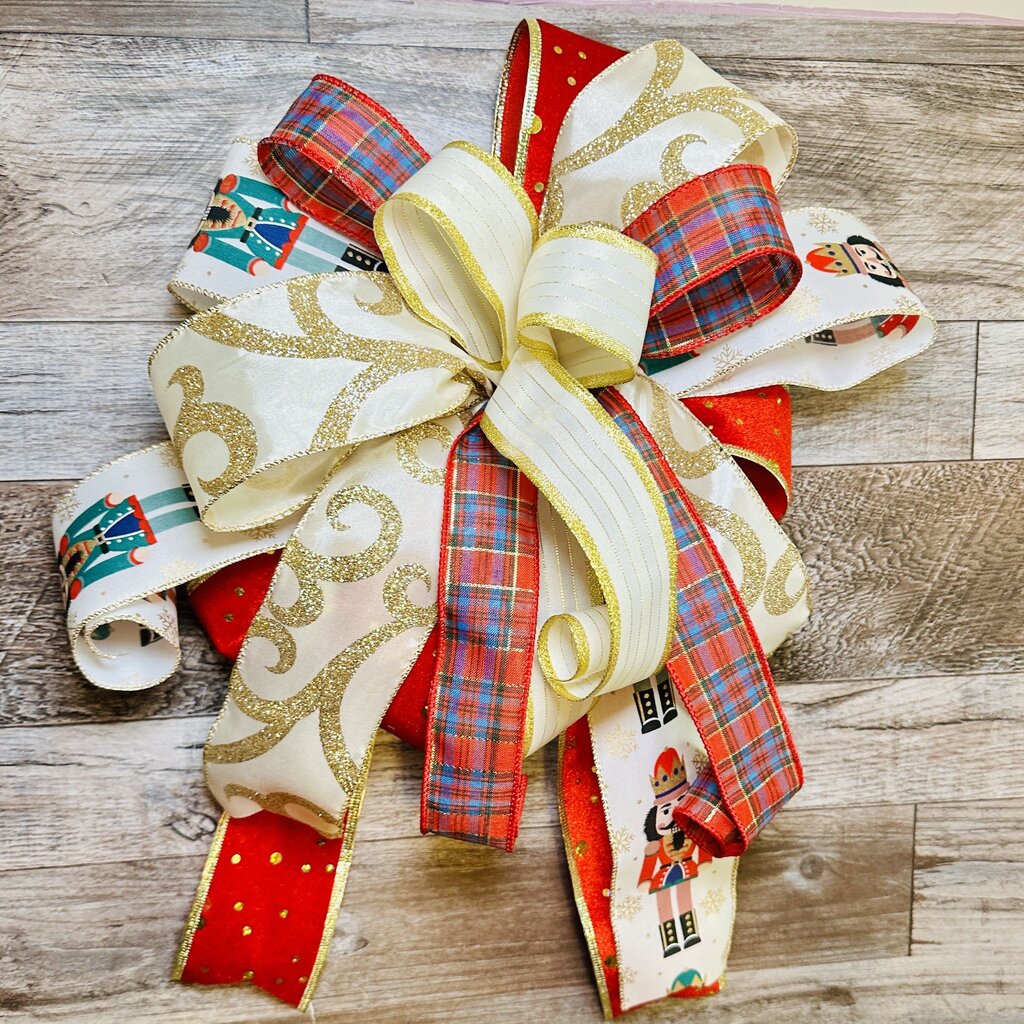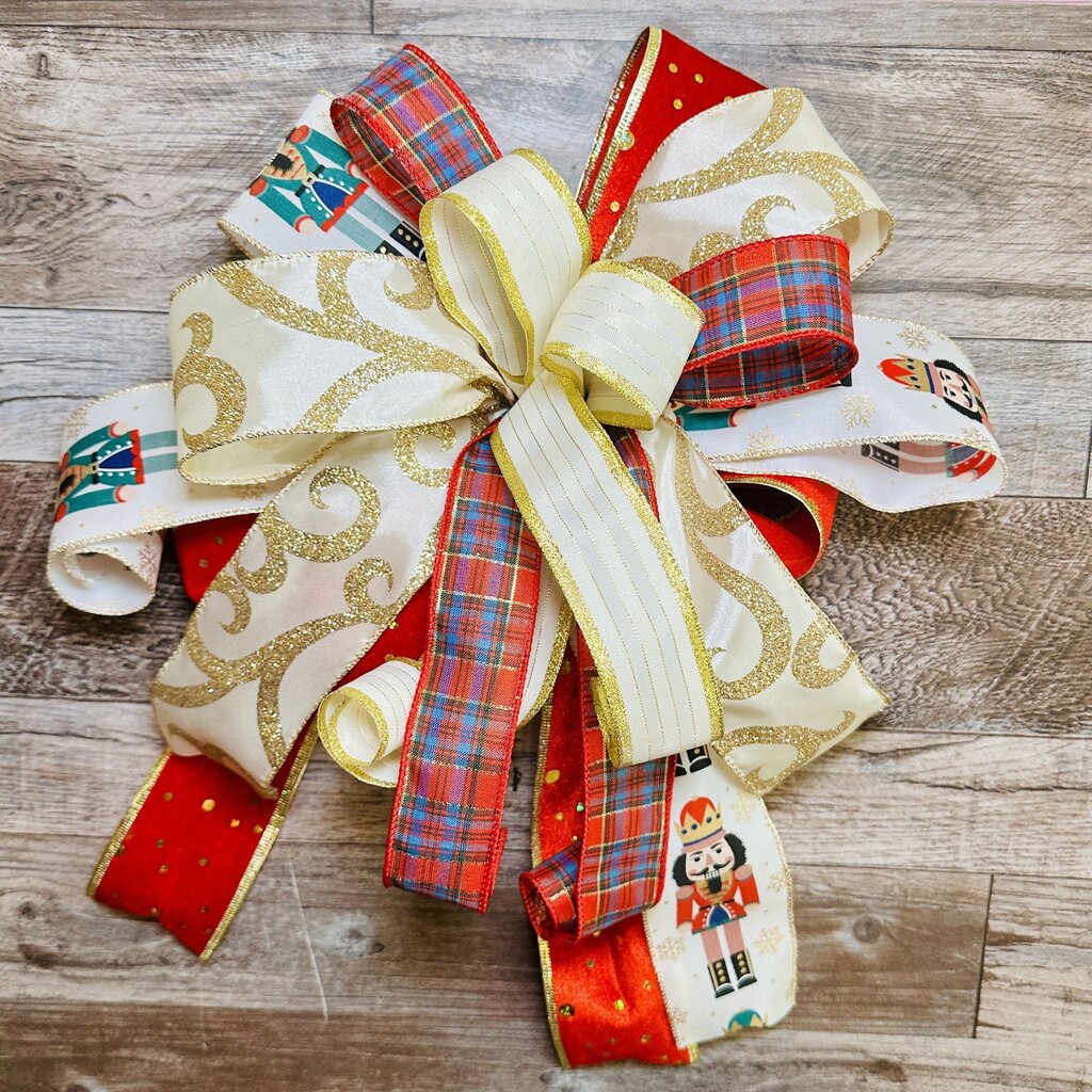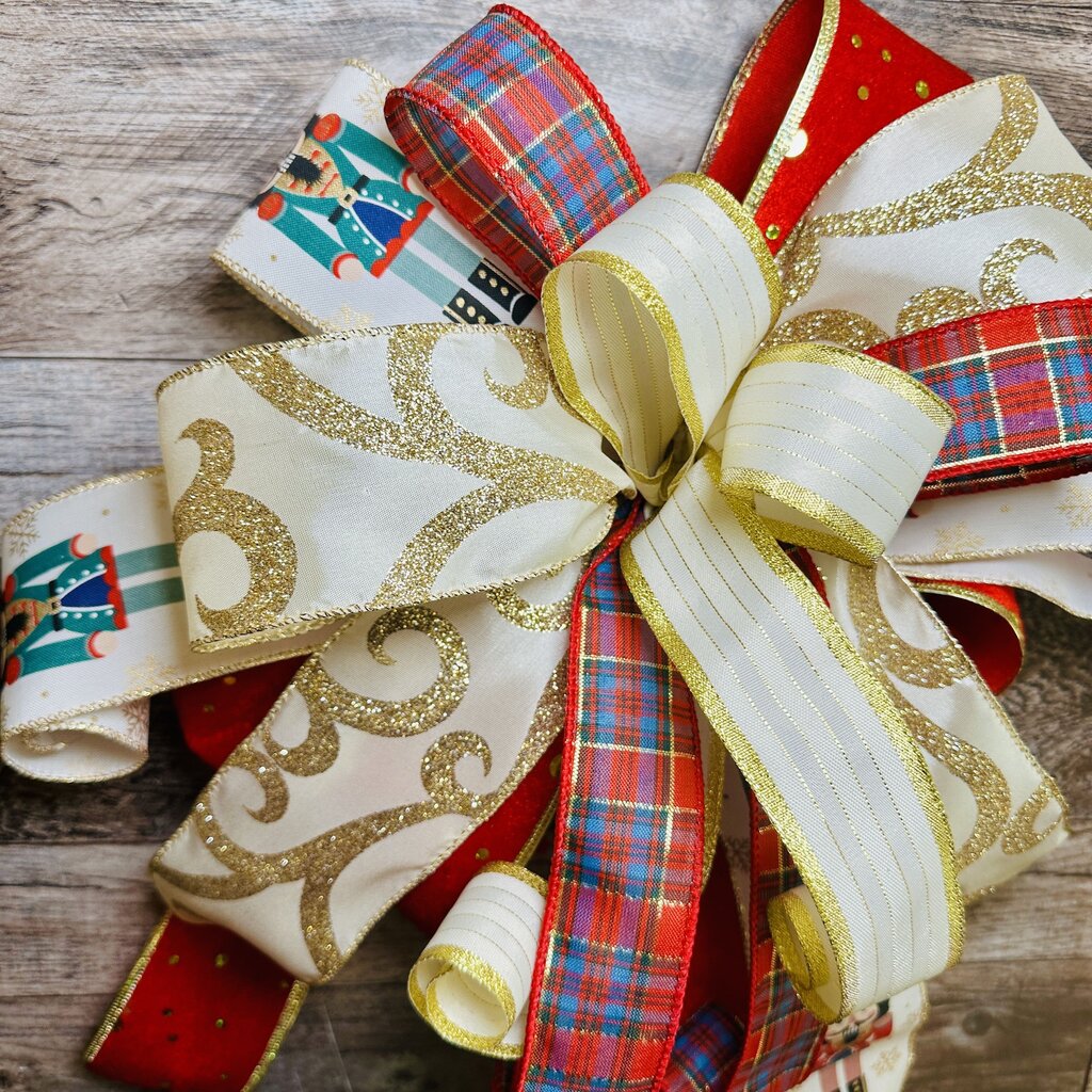 Handcrafted luxury Christmas bow made with premium designer ribbon in rich red, gold, and Nutcracker pattern. Perfect for tree toppers,...