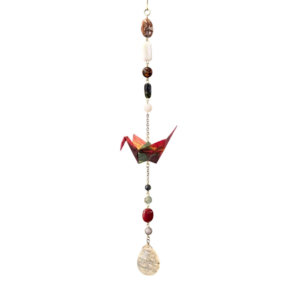 Unique ornament made with origami paper crane, beads, and salvaged jewelry. For decorative use only. Handcrafted in Laconia, NH.