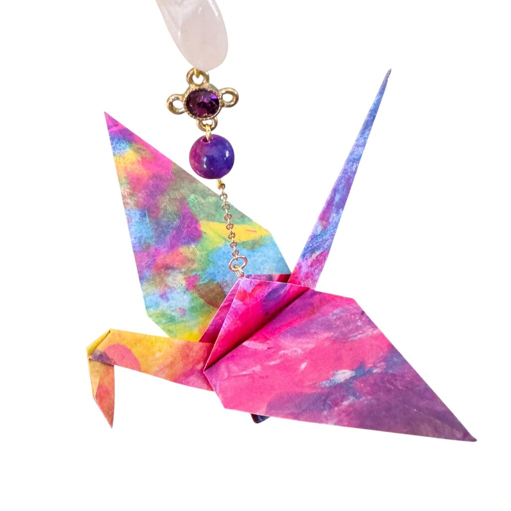 Unique ornament made with origami paper crane, beads, and salvaged jewelry. For decorative use only. Handcrafted in Laconia, NH.
