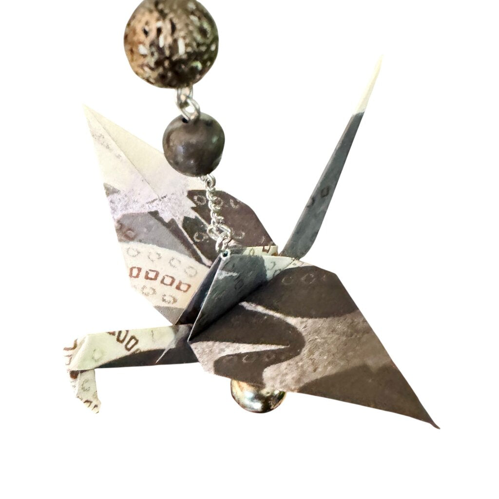 One-of-a-kind ornament made with folded origami, beads, and repurposed jewelry. Each ornament uses a mix of new and salvaged pieces....