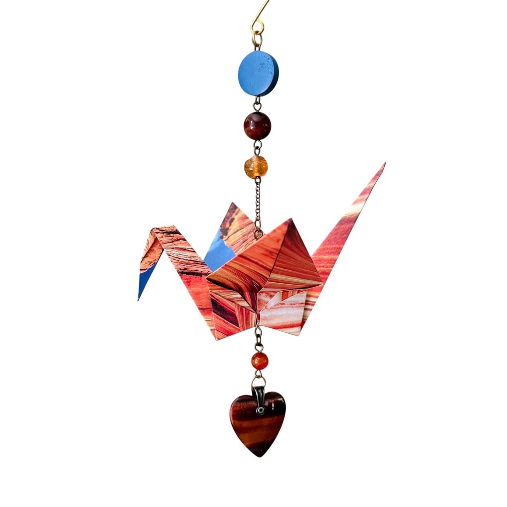 One-of-a-kind ornament made with folded origami, beads, and repurposed jewelry. Each ornament uses a mix of new and salvaged pieces....