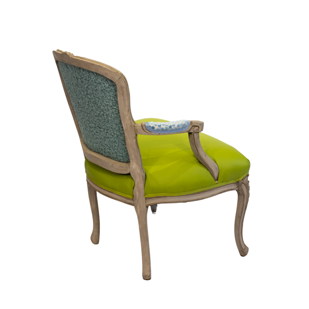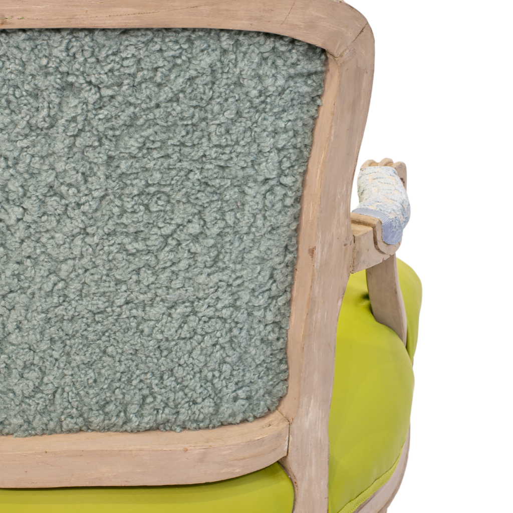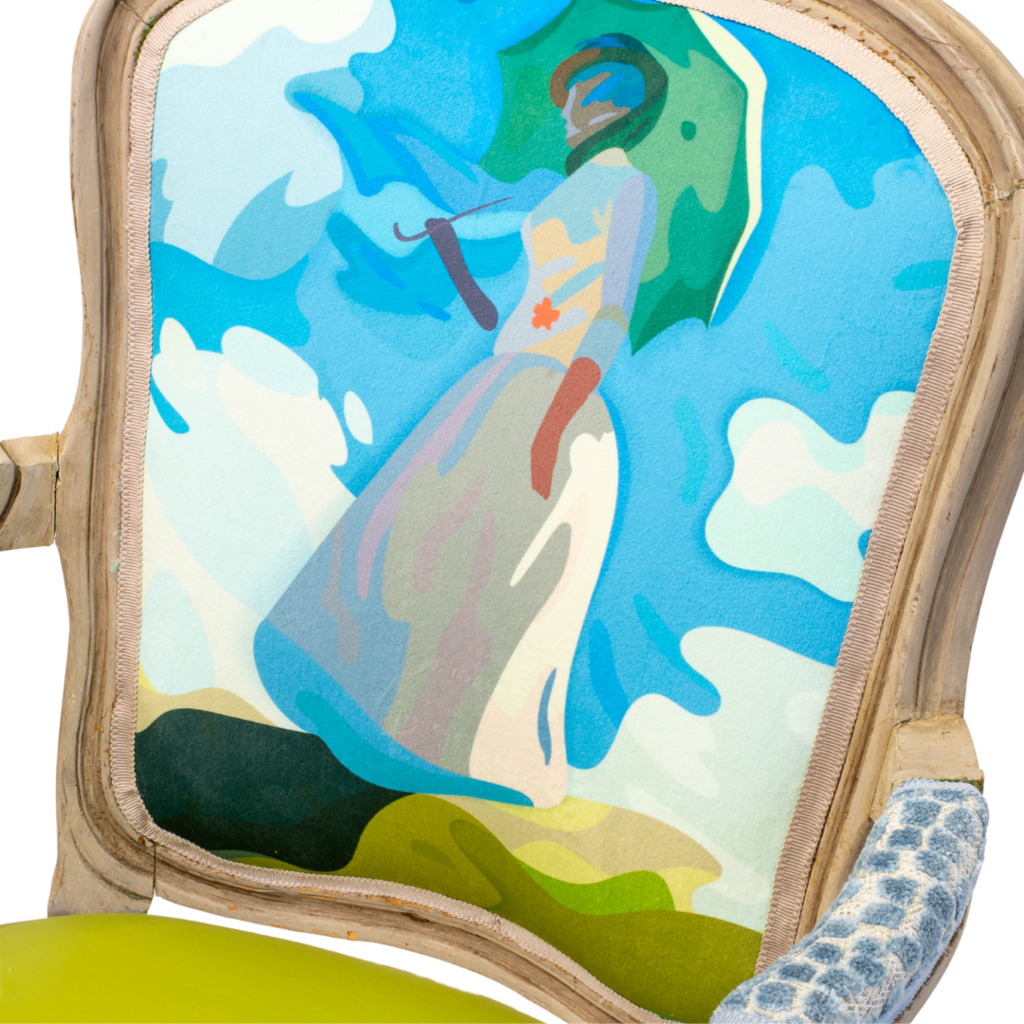 One-of-a-Kind newly upholstered French Provincial Louis XV Style Armchair upholstered in Meadow Green Leather paired with an illustration of "Woman with Parasol" by Claude Monet printed on velvet. Very good condition wood frame, minor scuffs wear; upholstery, new excellent!!!