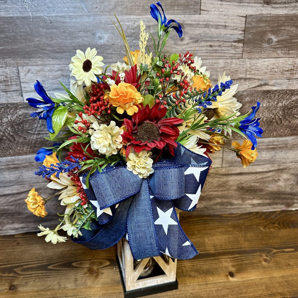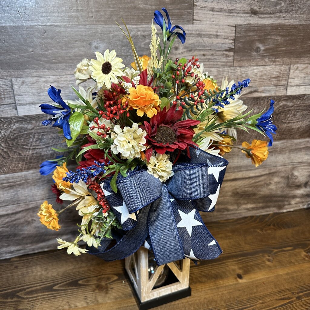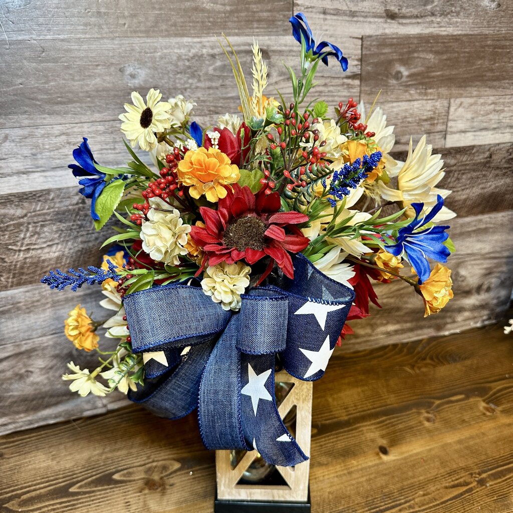 Celebrate the season with this patriotic floral arrangement in a wood lantern! Packed with bold faux blooms and topped with...