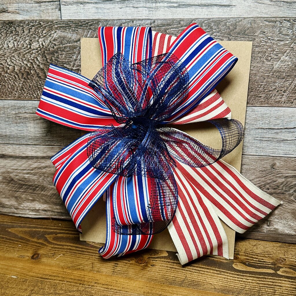 Perfect for your 4th of July wreath, porch decor, front door, mailbox, lanterns, or party displays—this bow brings festive American spirit to any space. Made with wired ribbon for easy fluffing and long-lasting shape, it's great for Memorial Day, Flag Day, Labor Day, or just showing your USA pride year-round!