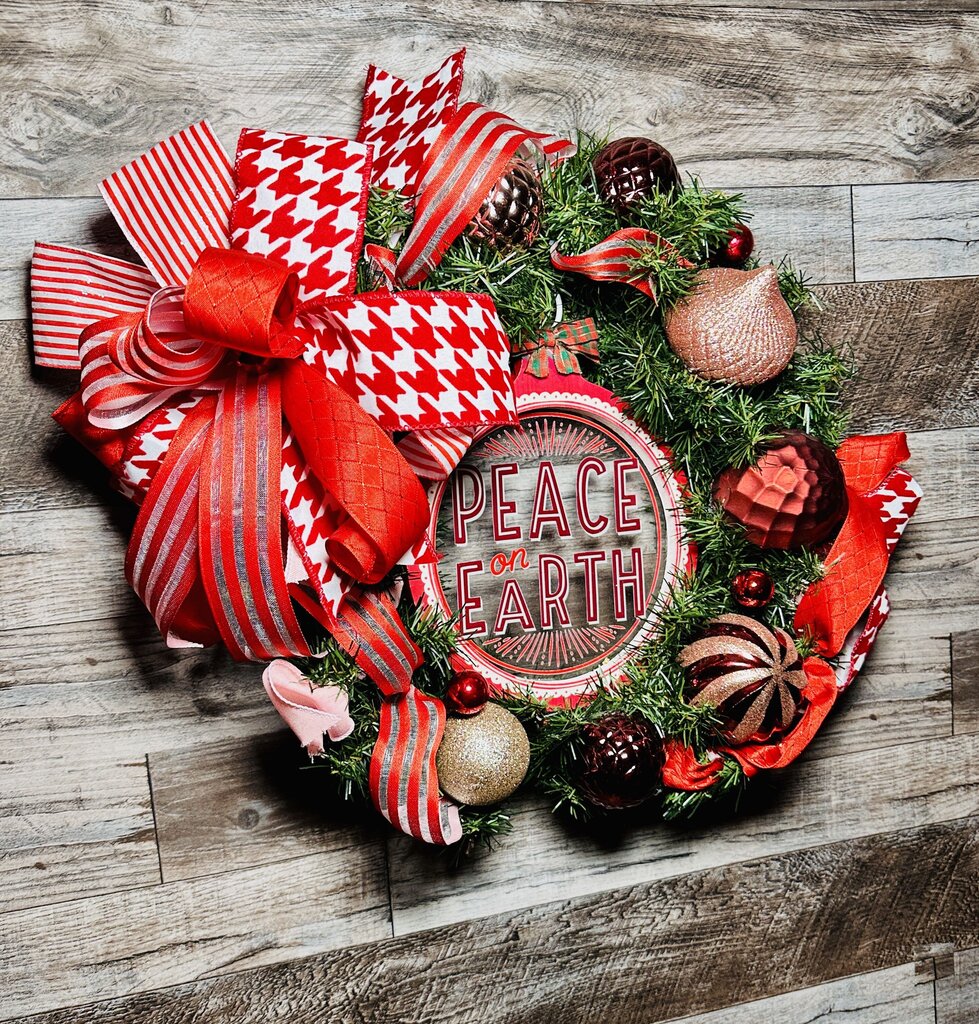 A festive evergreen wreath featuring red and blush ornaments, a bold designer bow, and a classic “Peace on Earth” centerpiece....