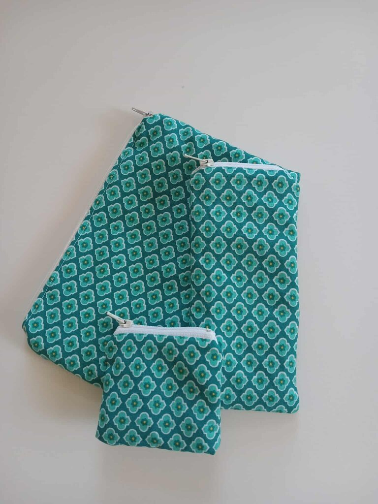 Includes zippered 8"x 5.5" pouch, zippered eyeglass case, zippered coin purse
