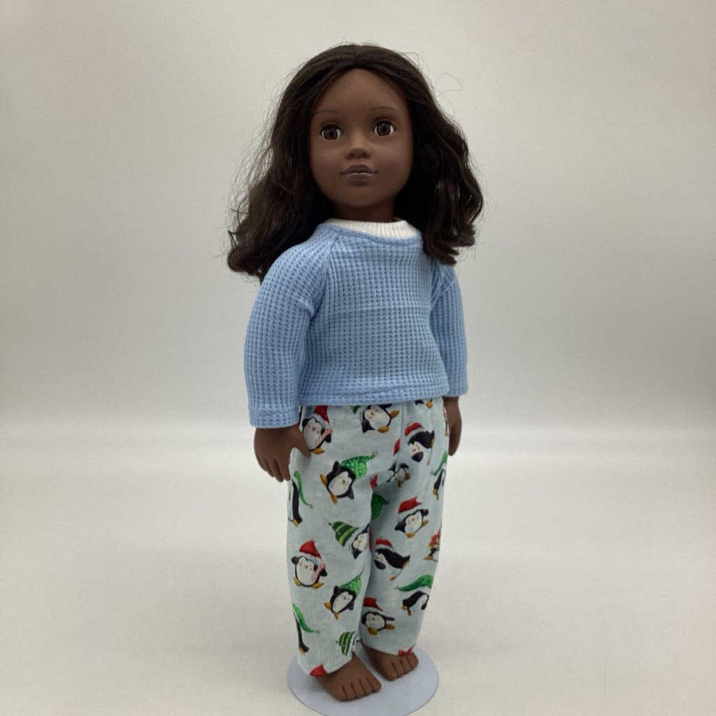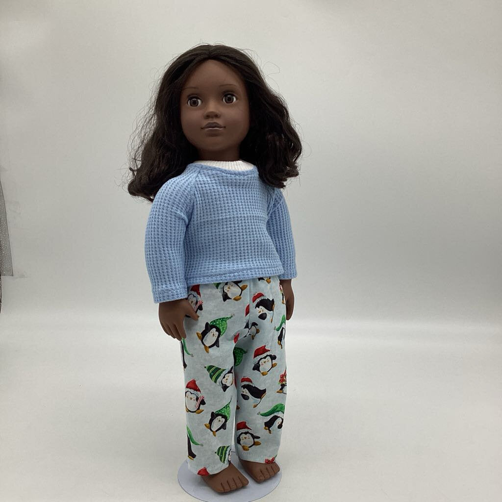 Blue Pjs with penguins on the pants. The penguins have Santa hats in different colors and designs. The shirt is...