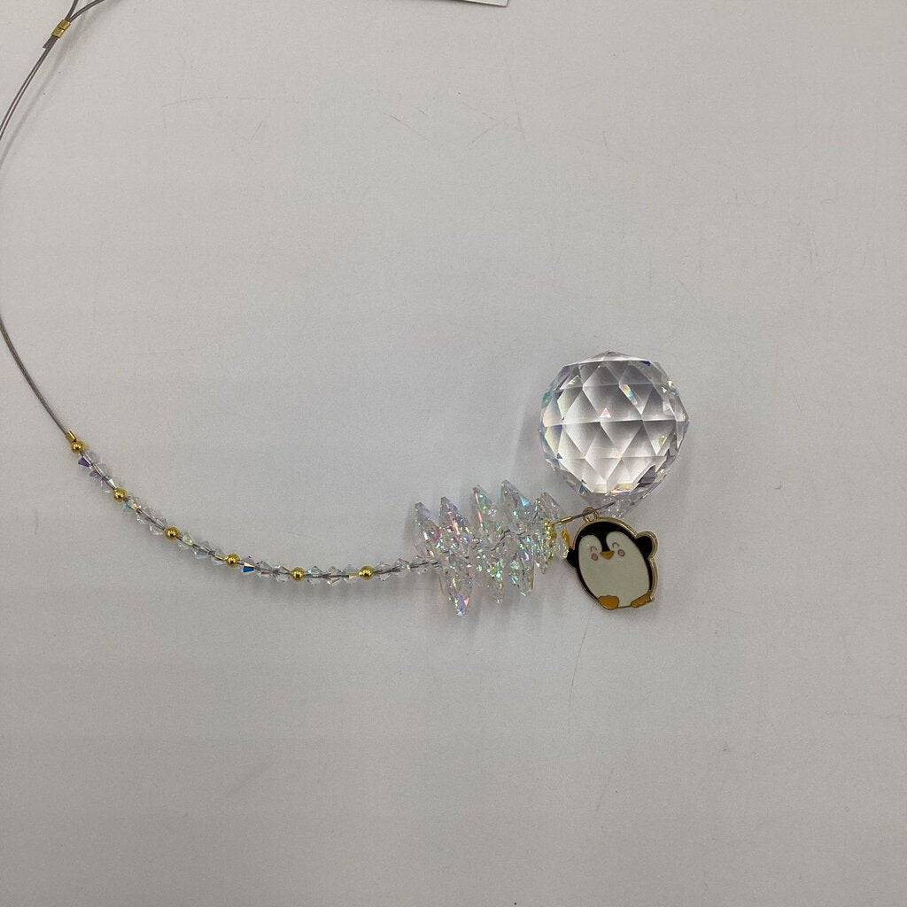 PENQUIN CRYSTAL SUNCATCHER W/ A 30MM CRYSTAL BALL AB, AURORA BOREALIS OCTAGON CRYSTALS, GOLD BEADS, PENQUIN CHARM 11" LONG