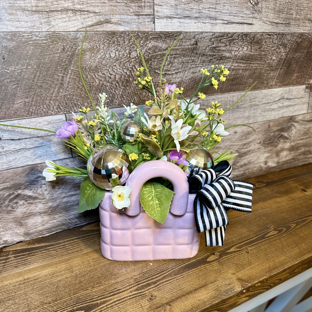 Bright, bold, and a little bit disco! 🌼🪩 This pink ceramic purse arrangement features faux florals, mini mirror balls, and...