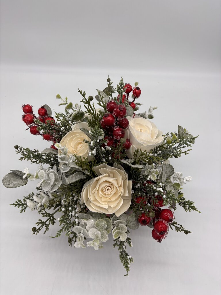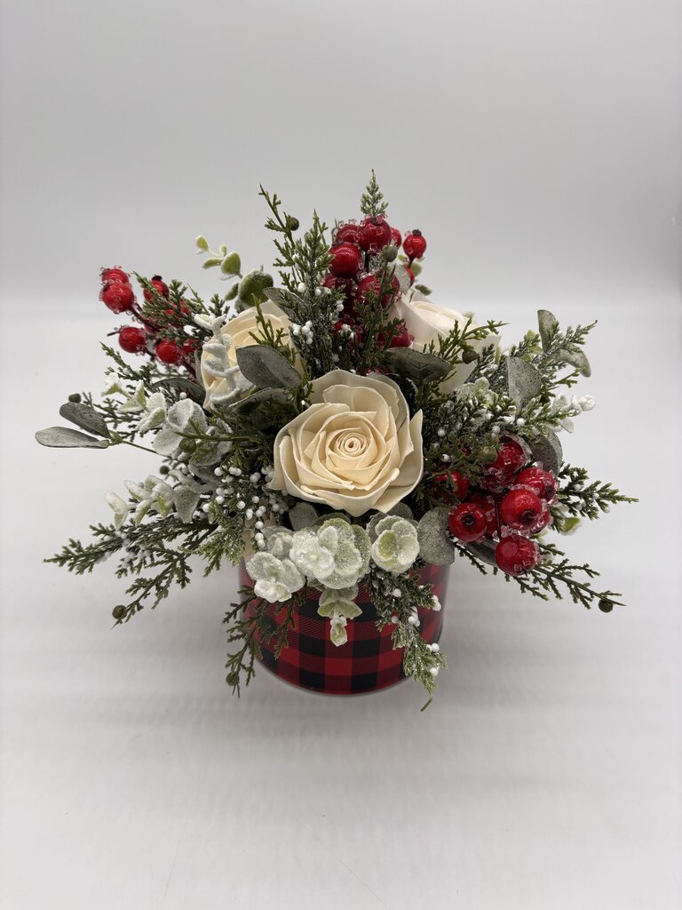 Plaid Tin Filled with Greenery and Sola Wood Flowers