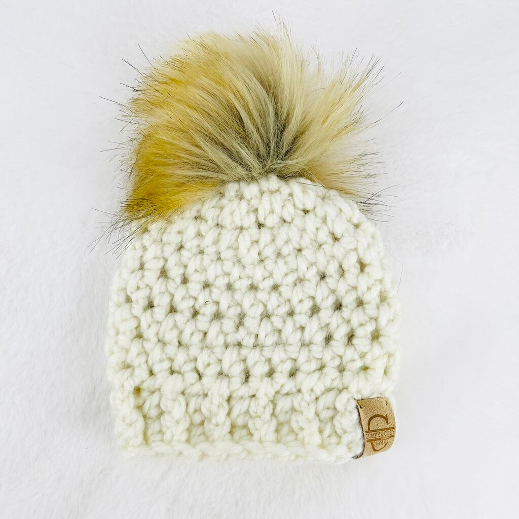 Crochet winter beanie hat. Made with acrylic yarn. Remove pom pom before washing. Machine wash gentle. Lay flat or tumble...