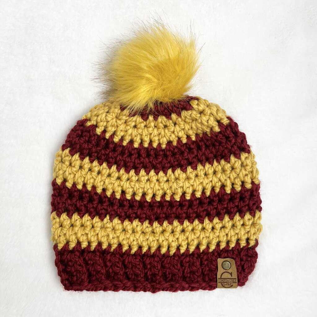 Crochet winter hat. Remove pom pom before washing. Machine wash gentle. Lay flat or tumble dry low heat.
