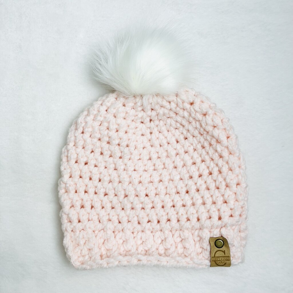 Crochet winter hat. Remove pom pom before washing. Machine wash gentle. Lay flat or tumble dry low heat.