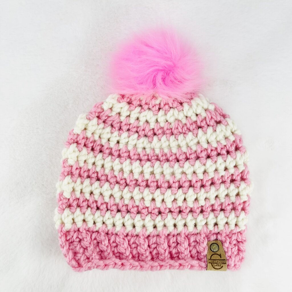 Crochet winter beanie hat. Made with acrylic yarn. Remove pom pom before washing. Machine wash gentle. Lay flat or tumble...