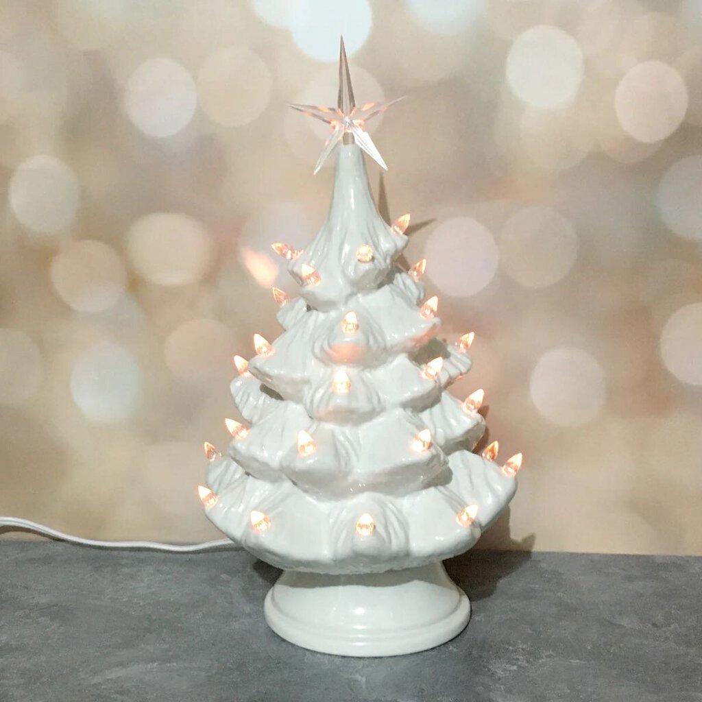 Tree and base are separate. Comes with multi-colored plastic lights and a clip in light kit that plugs into a standard outlet. Lights come unassembled. This way you can arrange how you would like or swap out if wanted. Glue is provided to attach plastic twist lights if wanted.