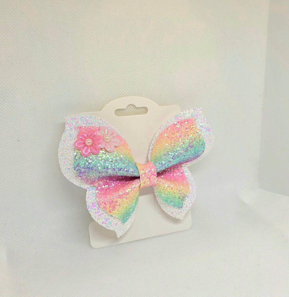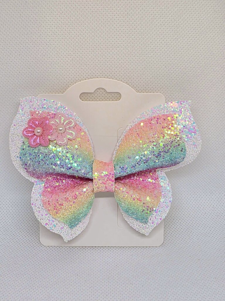 Key Features: Design: Unique butterfly wing shape. Sparkle: Covered in high-quality, chunky rainbow/pastel glitter. Embellishment: Decorated with a sweet cluster...