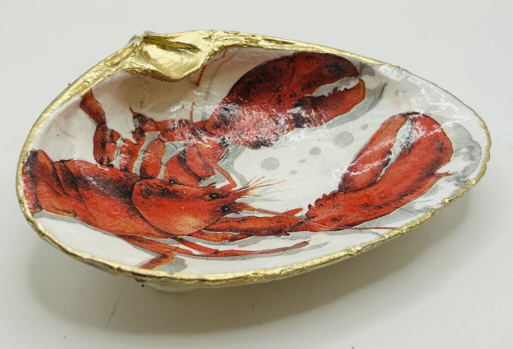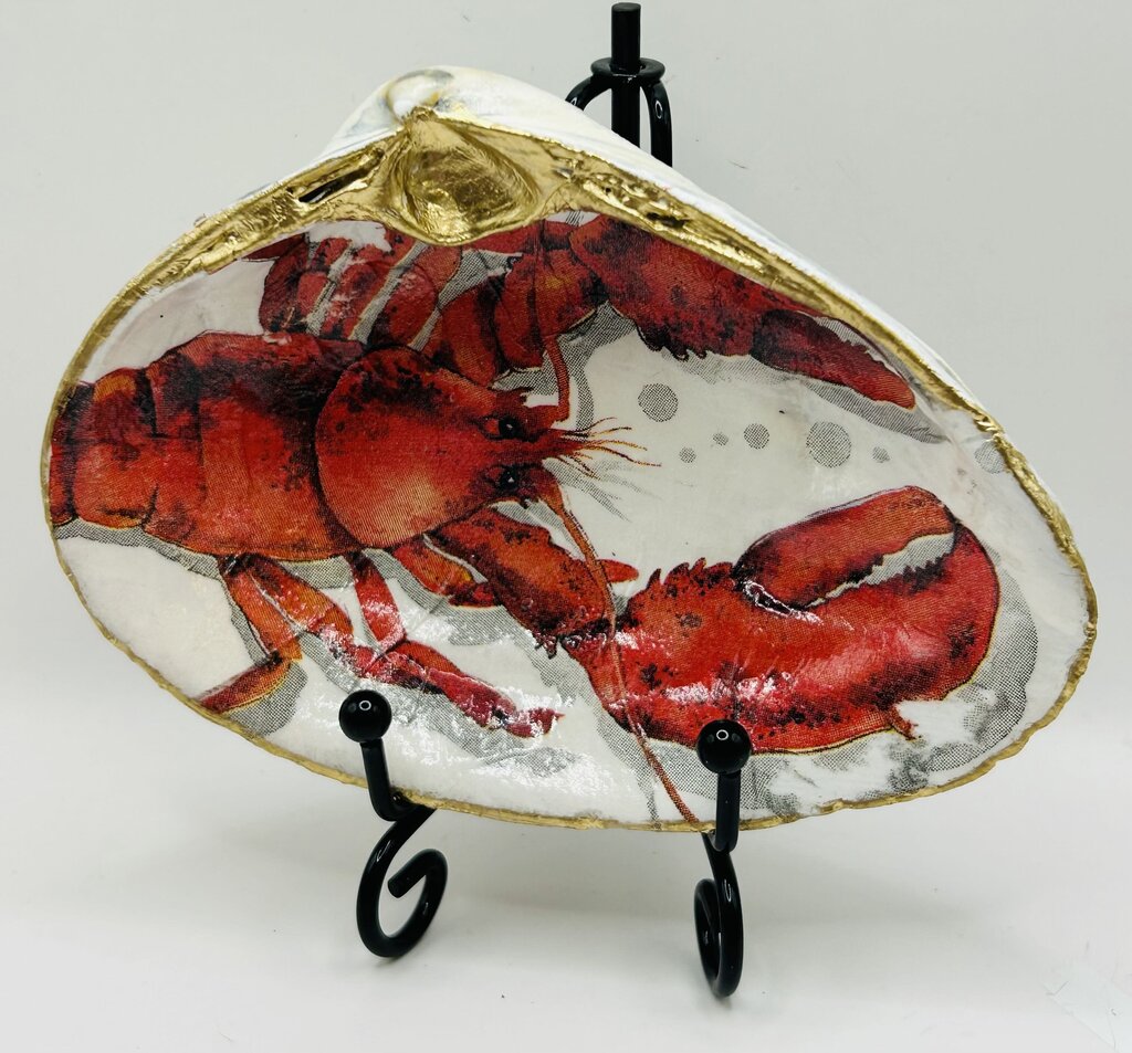 Hand collected and decoupaged Clam from Newport RI, decorated with a red lobster.. Measures 4.75" x 3.5"easures