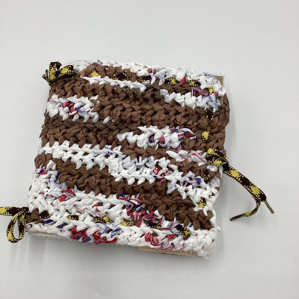 Made entirely of repurposed materials, crocheted plastic bag cover with old stock vintage shoelaces for closure. An eclectic mix of...