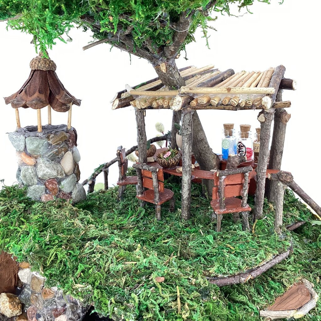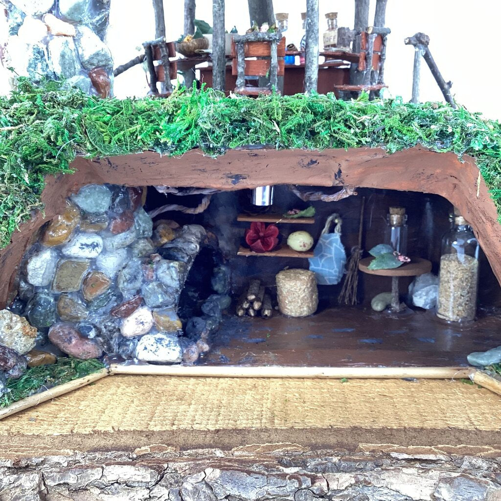 Gentle hill mounted restaurant with three chairs, acorn bowls brimming with "food", coffee mug "steaming" with cotton. Under the restaurant are steps that lead past flowers and a pumpkin patch to a door which leads to an underground kitchen. In the kitchen lies a large stone oven with full shelves, stacks of fire wood, apron, broom, and table. There are two twistable battery powered lights (interior light is magnetically attached). Materials are mostly of natural materials with moss, sticks, stone, decorative flowers. The restaurant rests on top of a slice of wood.