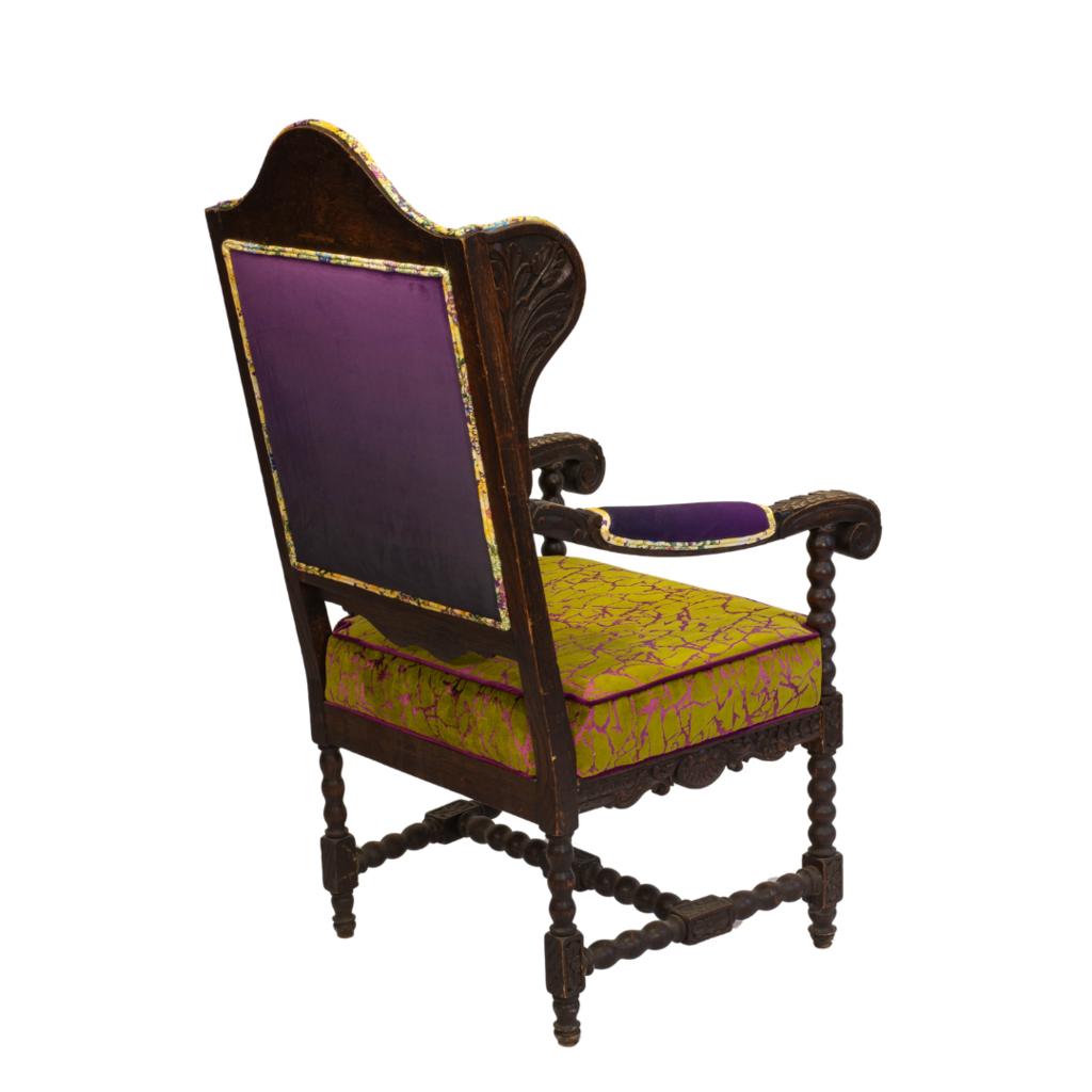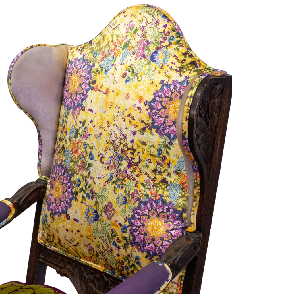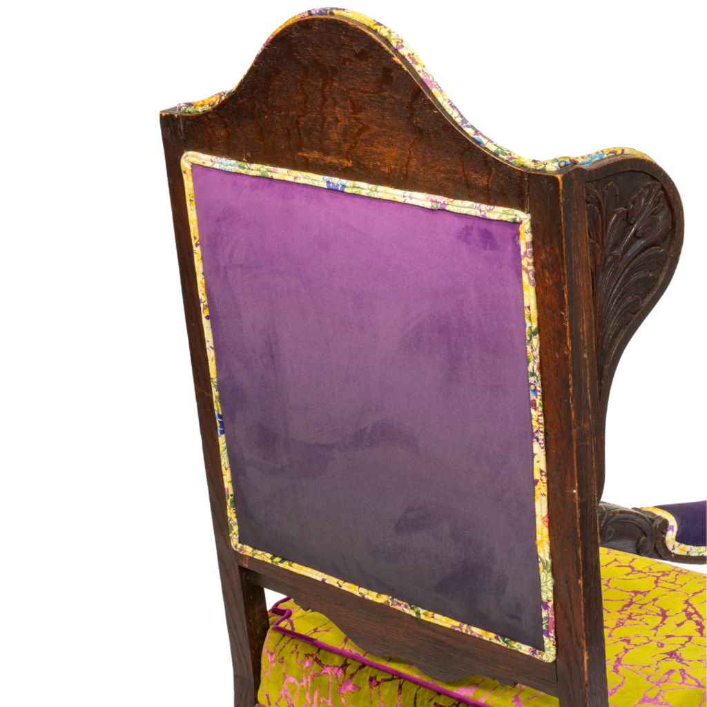 One-of-a-Kind newly upholstered Vintage 19th Century Jacobean Style Wing Chair with Printed Yellow/Gold - Purple Multicolored Velvet for the back and Stroheim Roman fabric - Library Moss on the seat. Plum Ombre adorns the back and arm pads. Very good condition wood frame, minor scuffs wear; upholstery, new excellent!!!