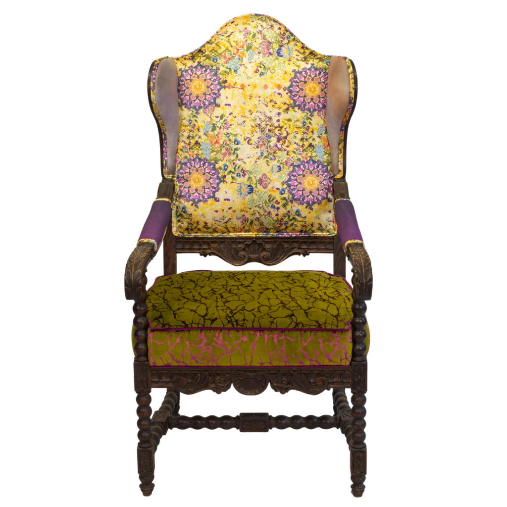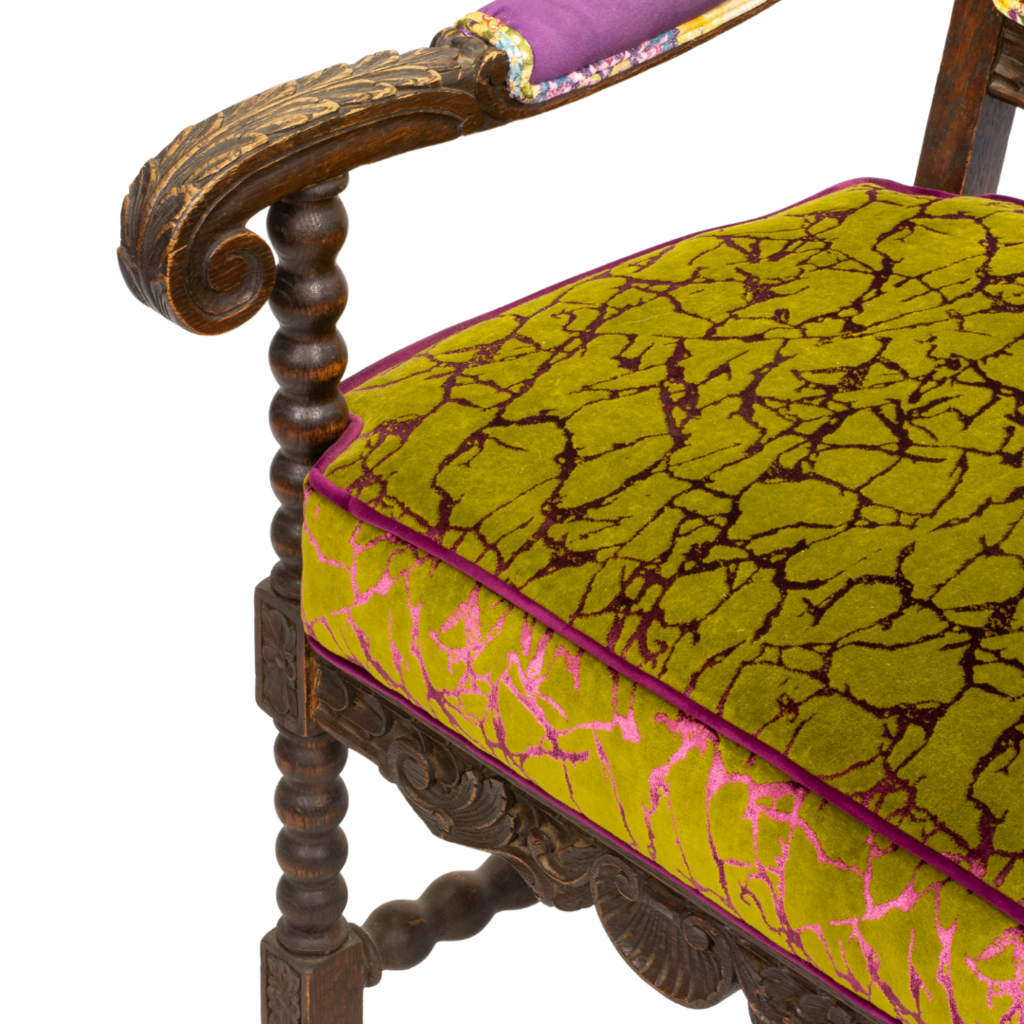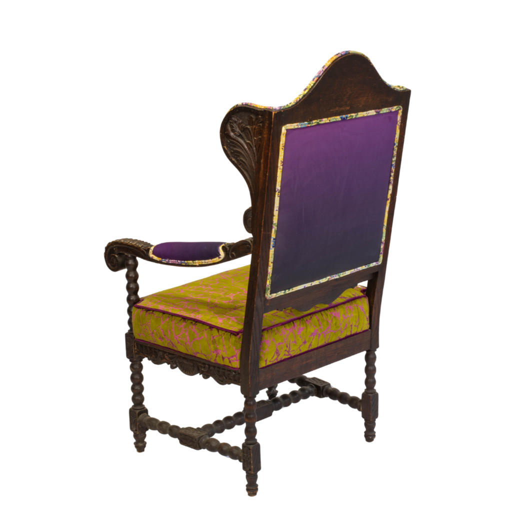 One-of-a-Kind newly upholstered Vintage 19th Century Jacobean Style Wing Chair with Printed Yellow/Gold - Purple Multicolored Velvet for the back and Stroheim Roman fabric - Library Moss on the seat. Plum Ombre adorns the back and arm pads. Very good condition wood frame, minor scuffs wear; upholstery, new excellent!!!