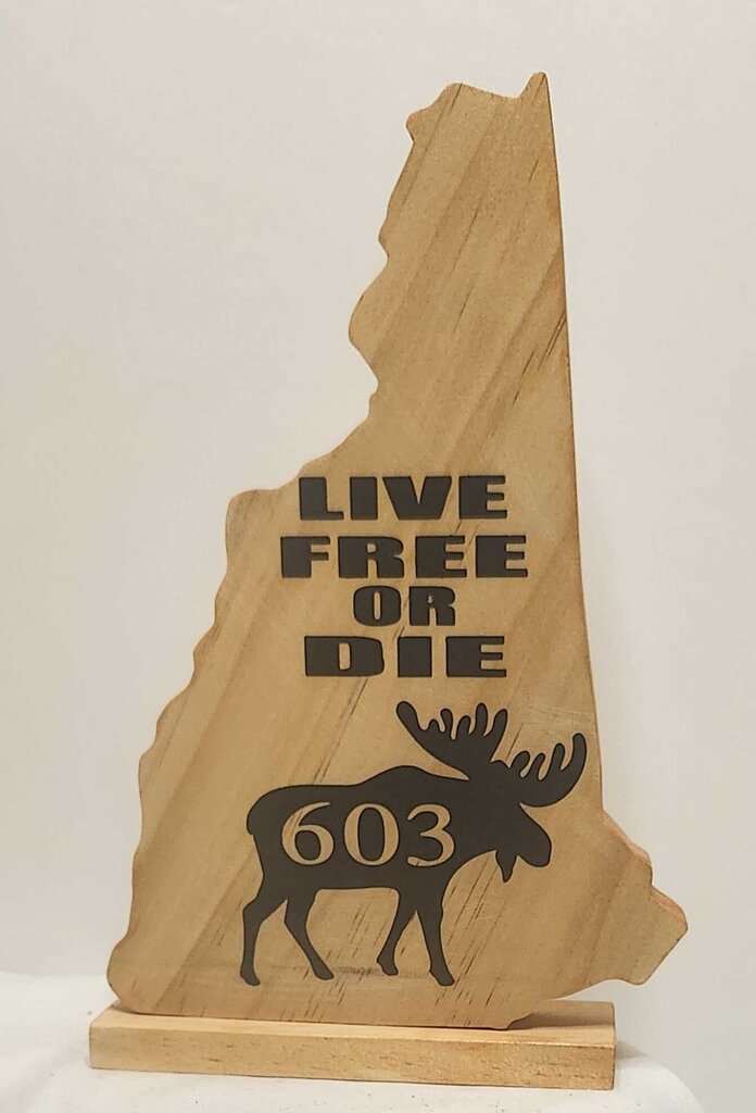 Shelf sitter- NH state shape (Live free or die moose 603)