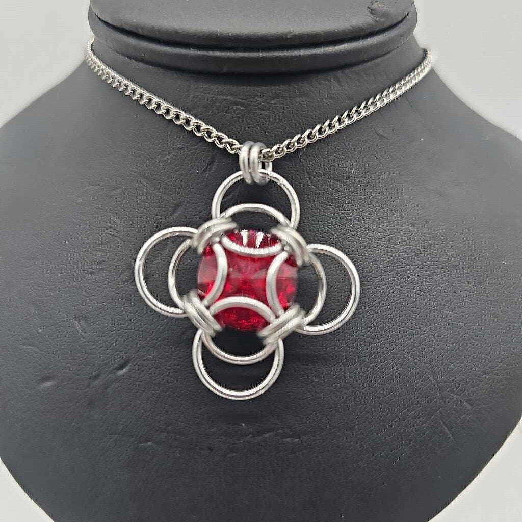 Silver Morning Star 14mm Siam Red Crystal, 18 inch stainless steel chain