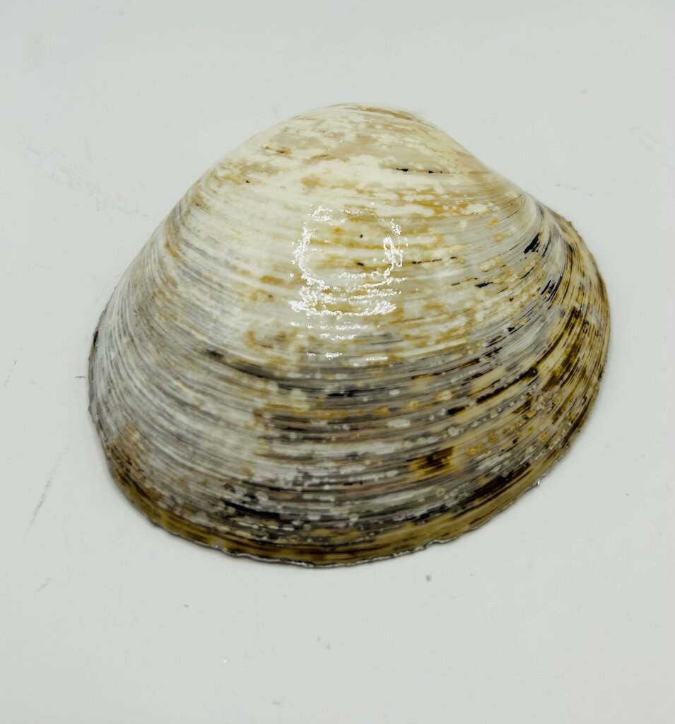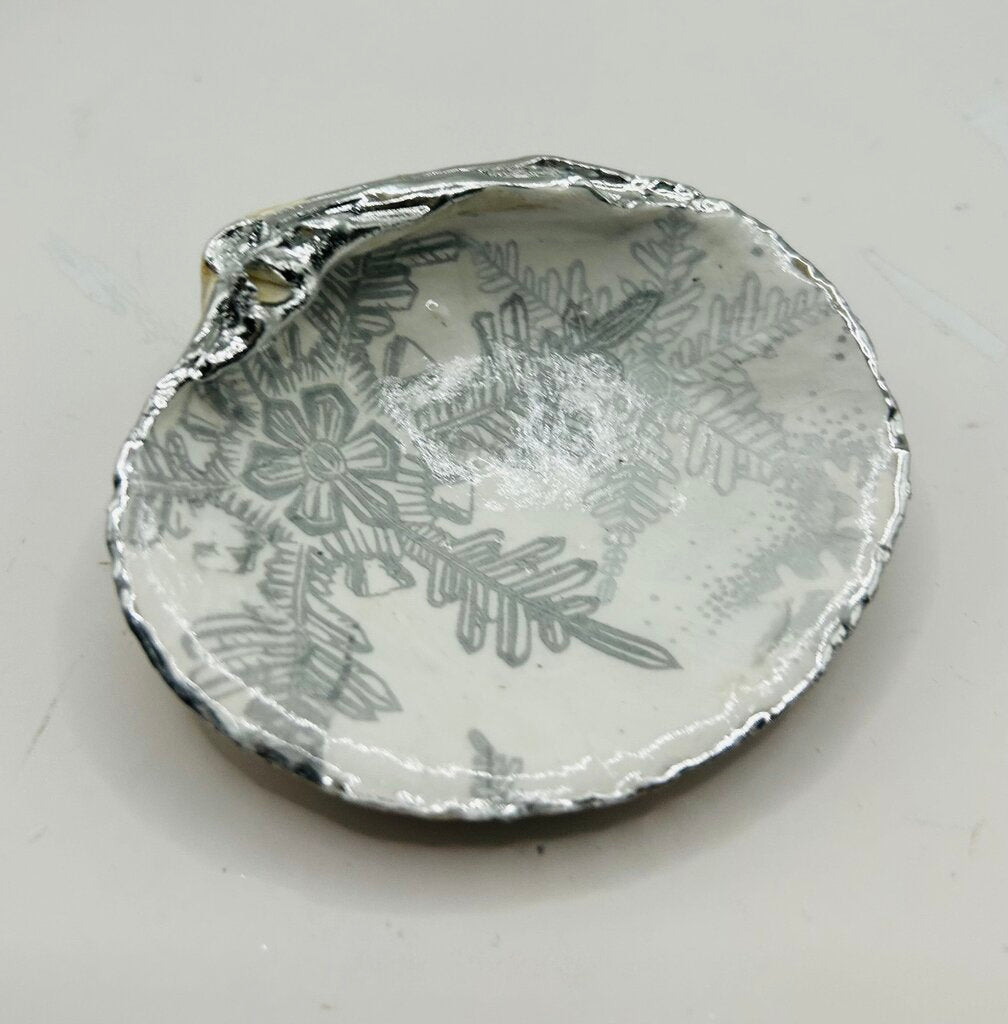 Hand collected and decoupaged Quahog from Nahant Beach. A gorgeous chrome edge lines this Quahog.The back of this shell, along...